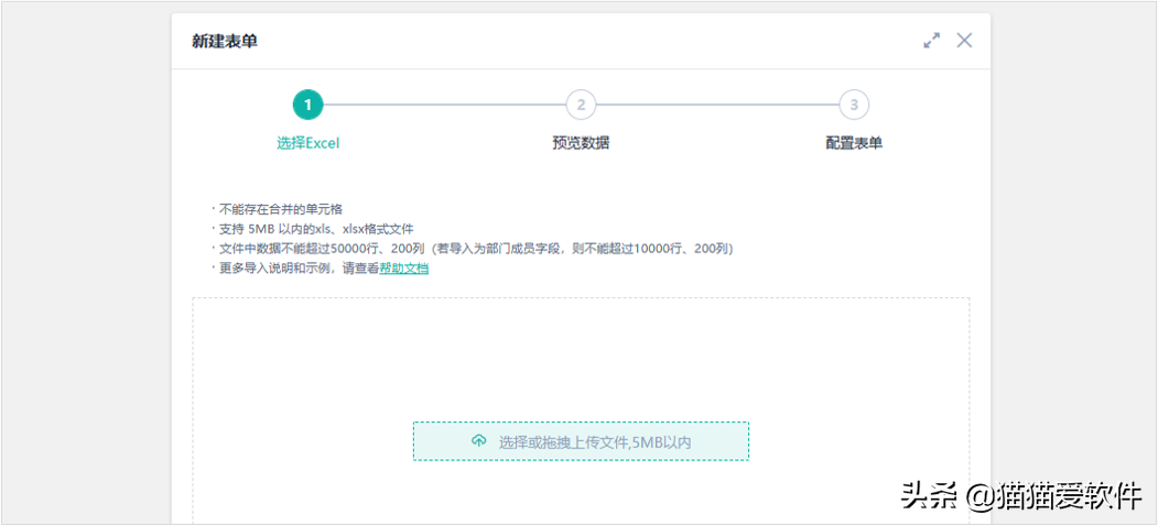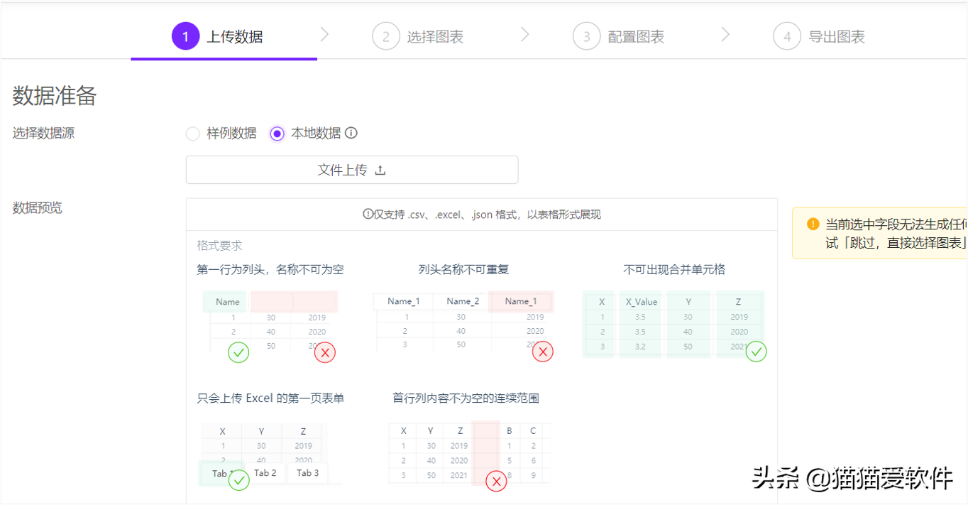 ①上传数据,支持本地数据导入(仅支持 .csv、.excel、.json 格式,以表格形式展现)