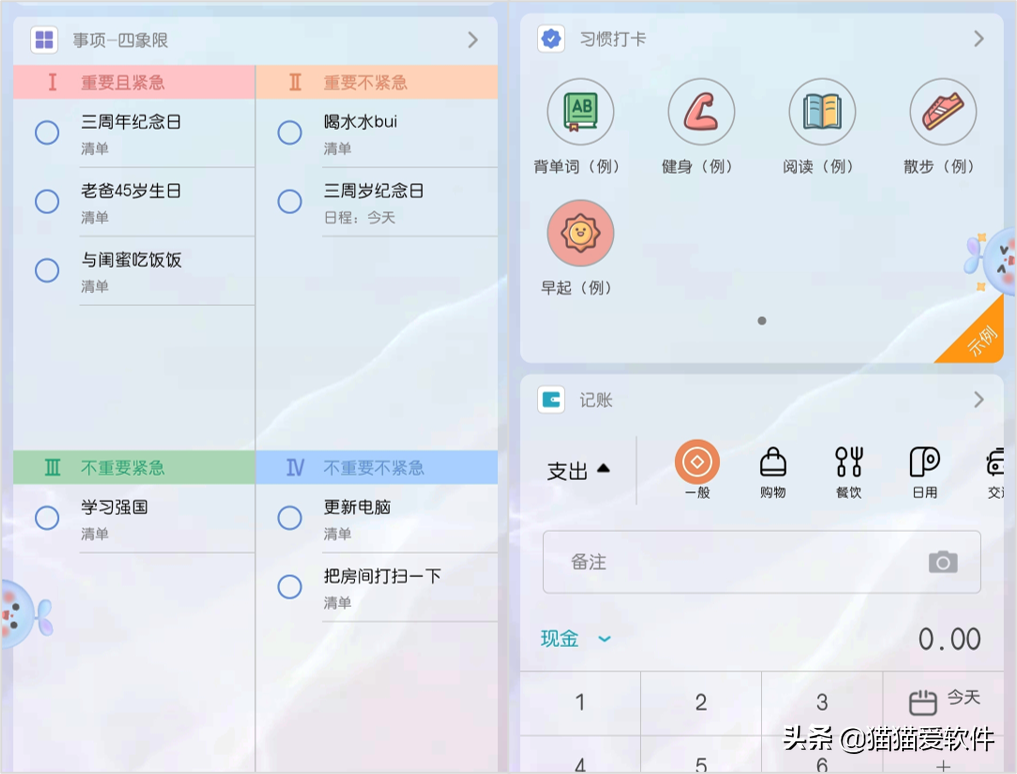 它还有一些其他的功能,比如说倒计时,提醒喝水,记录生日,记账、记录工作排班表、生理期等等。