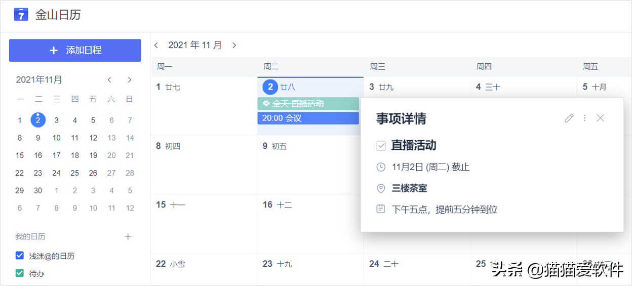 可以将日程安排添加到日历中,根据自己设置的时间,会在文档页面或者是微信(小程序)中准时提醒你,不用担心日程会被遗忘。