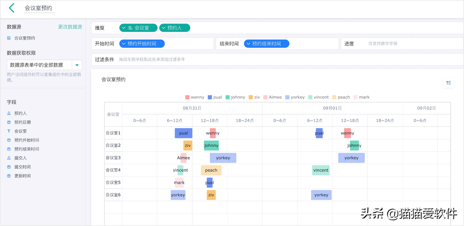 在简道云中,可以用甘特图做任务管理,清晰展现任务开始时间、结束时间、任务进展,方便自己对手头工作做实时监测和总结,做好规划。如会议室预约情况、课程预约情况等。