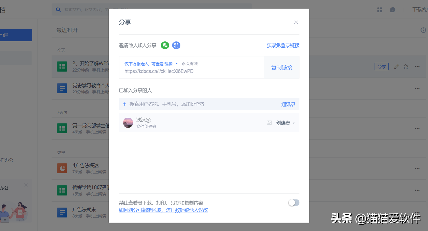 其次,金山文档可以通过分享链接或者扫描二维码的方法实现多人在线编辑。