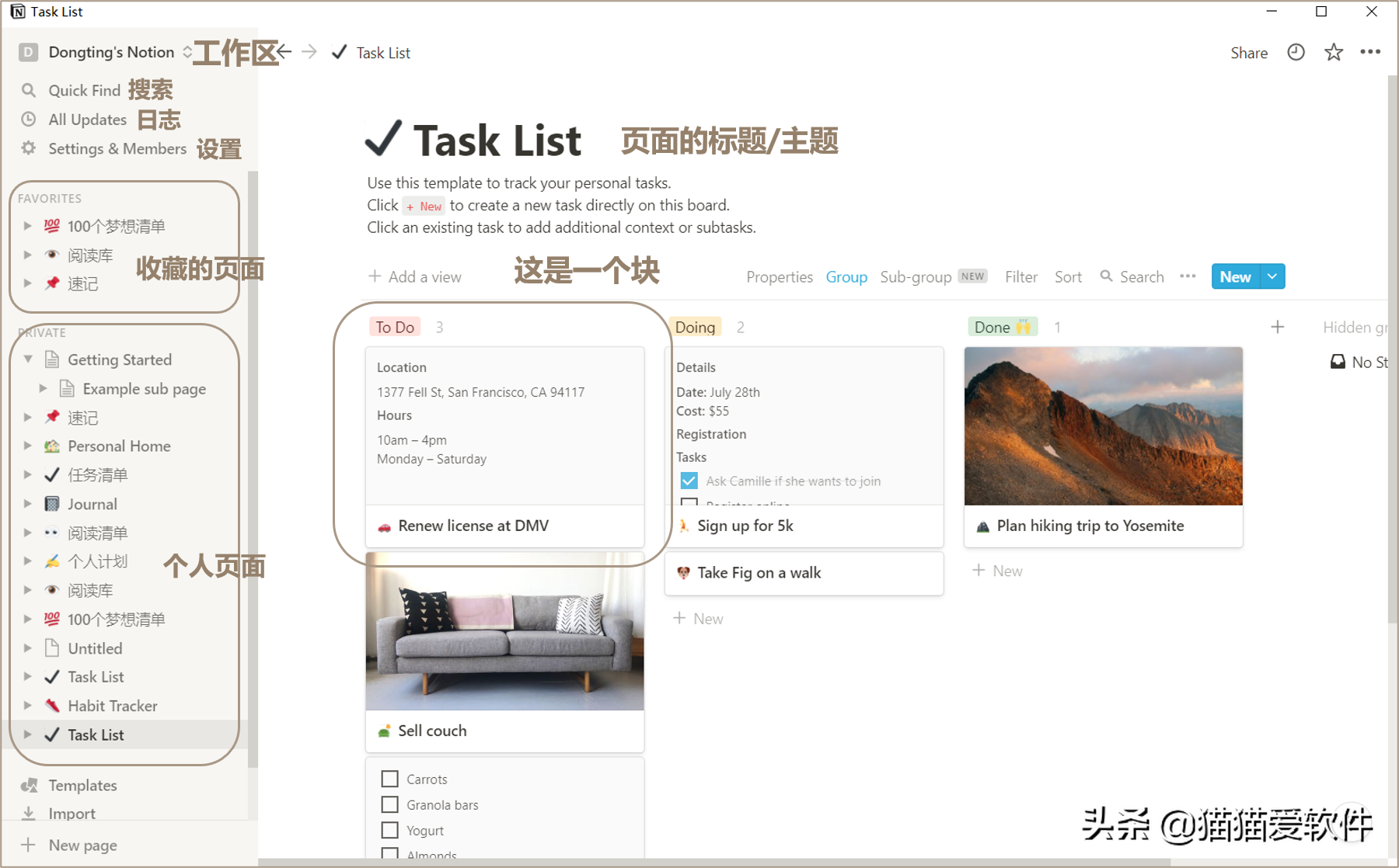 notion的页面支持无限等级,类似于文件夹的功能。然后每个页面由几个模块组成。
