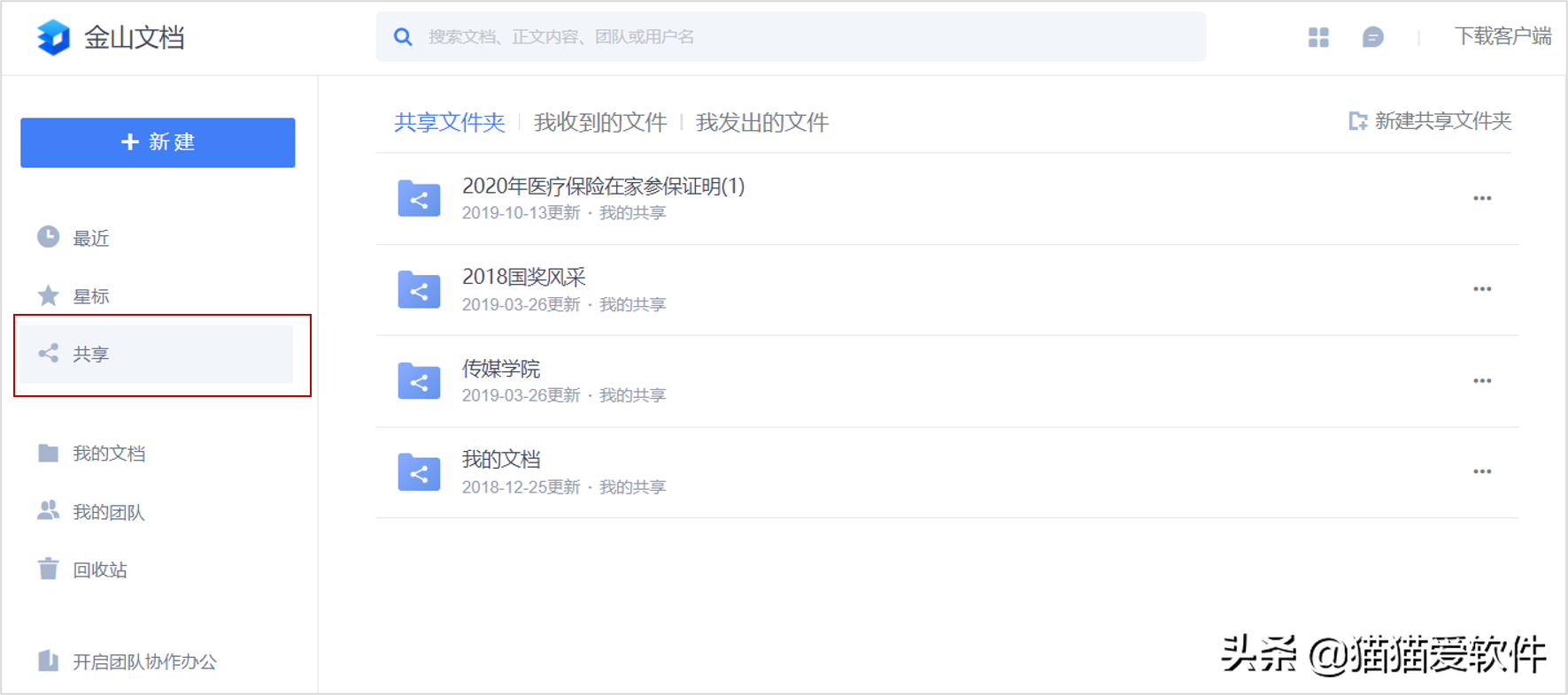 可以在【共享】里查看自己共享出去的文档,以及接受到的别人的共享文档。