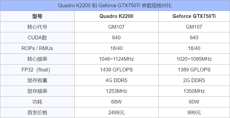 K2200和GTX750Ti都属于Maxwell架构,而且它们都用的是同一颗名为GM107的核心,并且连CUDA核心数量,SM单元、L1、L1缓存都是一样的规格。那么问题就来了,既然用的是一模一样的核心,为什么还要分出两种不同的系列?更重要的是它们直接的差价还很大。750ti当年的首发价格是999元,而K2200差不多在2500元。这么一比,同样的核心,只是系列不同,差价却高达2倍之多,这不是明抢么?所以本站就为大家带来两款相同核心的Geforce和Quadro系列显卡,用测试对比的方式来为大家解答这个问题。