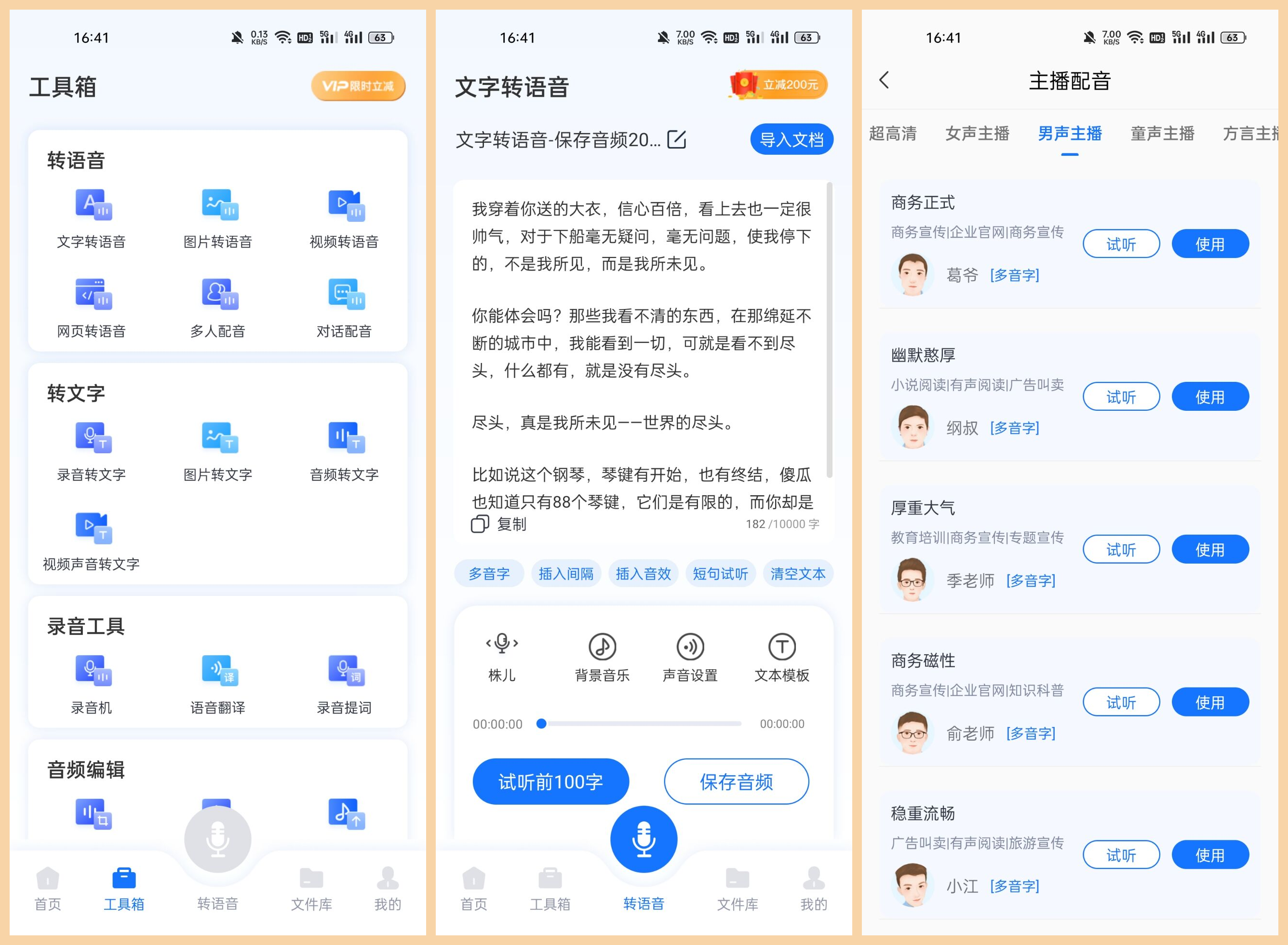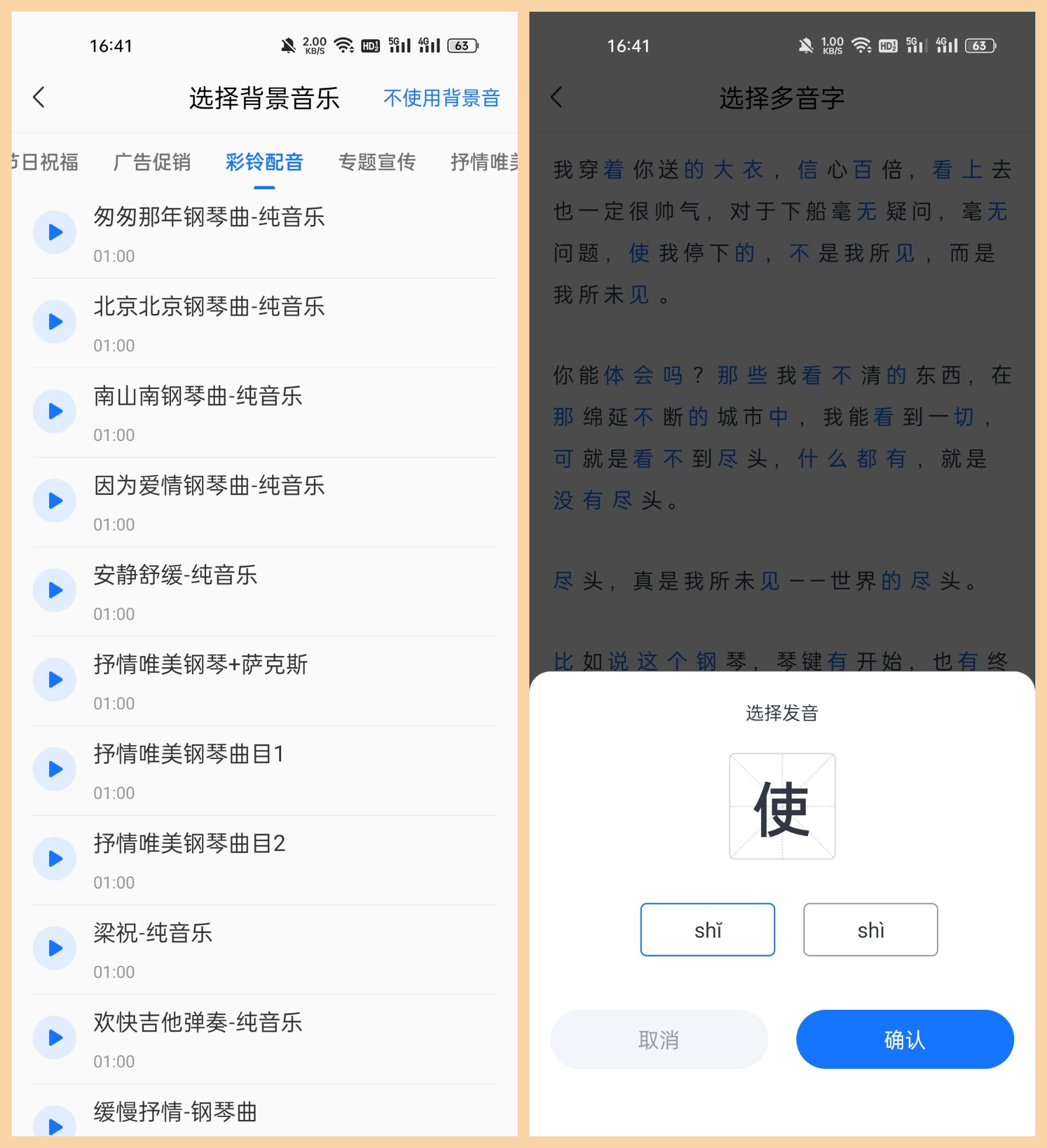 它的操作也十分简单,只需要上传文字,选择主播就完成了。还可以选择不同的背景音,就算你是录制广告、商场叫卖都不在话下,还设有多音字识别功能,让发音更精准。