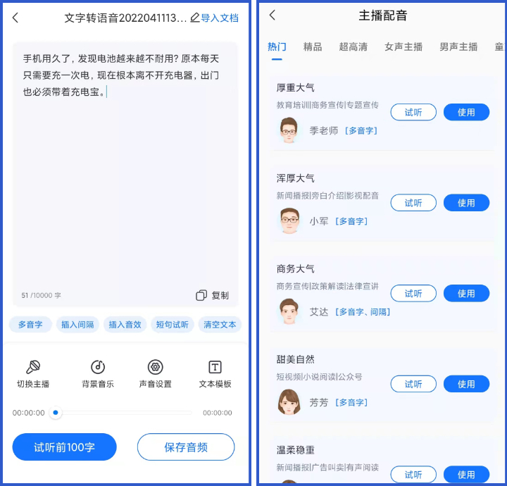 不仅如此,它能将文字转换成音频,甜美女声、浑厚男音、可爱女童……几百种声音类型可供我们选择!