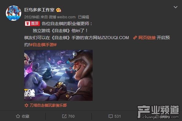 今天下午,《自走棋》手游官博“正版自走棋”宣布自走棋手游来了! 巨鸟多多即将推出《自走棋》独立游戏,并放出了游戏预约地址。巨鸟多多工作室官方微博随即转发了这个消息,并单独推送一条消息宣布了同样的内容。