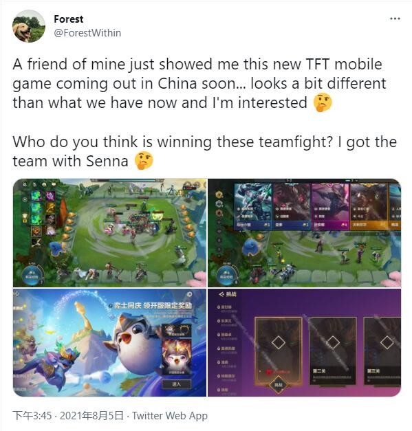 国外KOL推特上还爆料了英雄联盟云顶之弈正版授权手游《金铲铲之战》的一些游戏截图,从棋子是可以识别出版本,《金铲铲之战》的版本应该和端游同步是S5.5,因为其中就格温、狗熊、破败女枪等英雄。