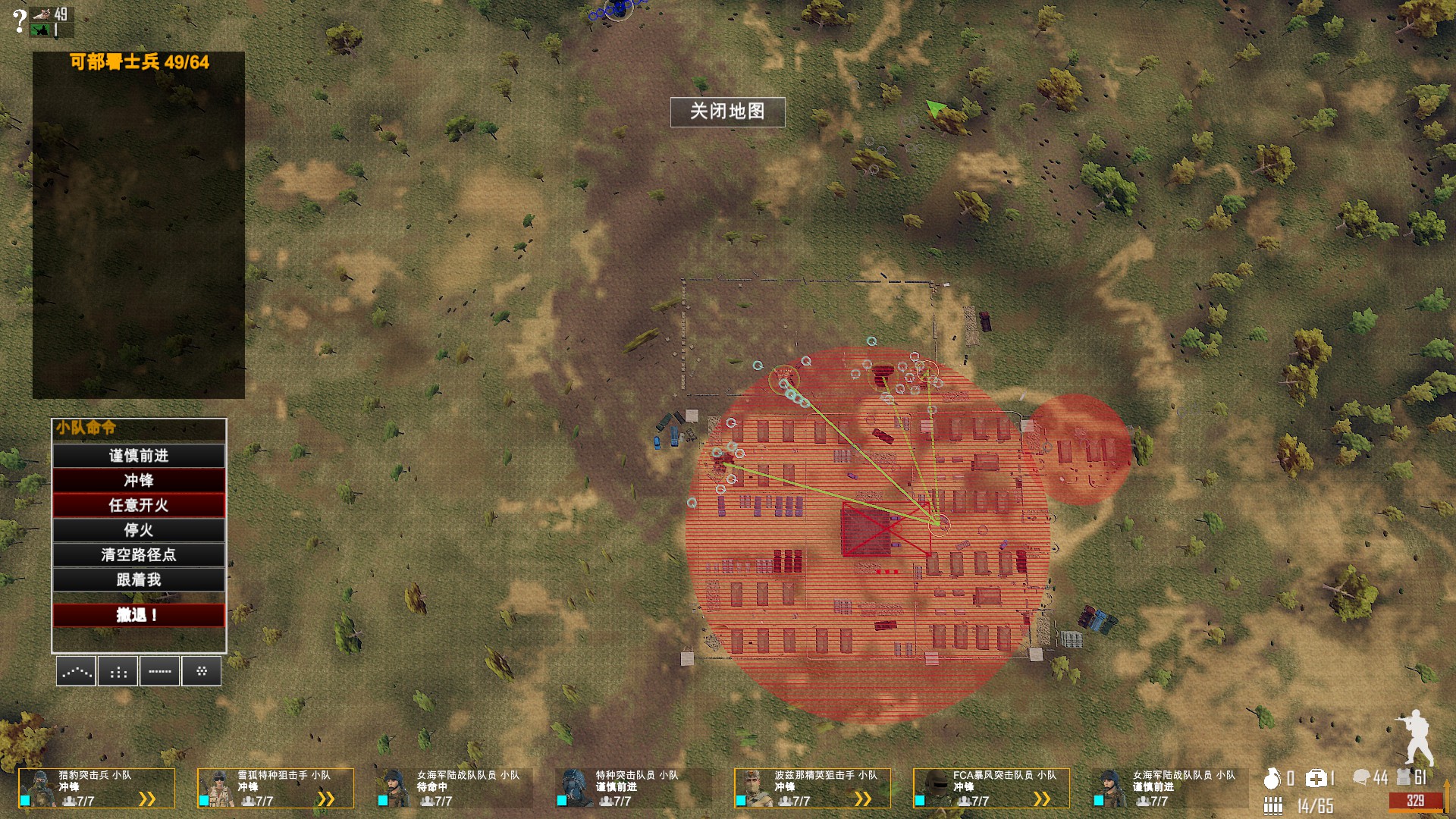 由于游戏突出的是游击战争,那么战场肯定要突出大,但这产生一个问题,既然是游击战那么作为战斗发起方应该是可以自由选择位置,是突然袭击像墨西哥毒贩那样埋伏政府车队,还是像电影孤独的幸存者那样在远方进行战略部署和追逐战,但在自由人里无论是发起方还是被发起方战斗永远是双方从地图最远的一个方向出生,战斗5分钟里有1分多钟是在找敌人,有时敌人会直线攻击,但有时敌人如果不走直线那你就得花更长时间去找他们,对于一个需要频繁交战的游戏,这样长时间的寻找过程是非常难熬的,而且游戏也无法做到像骑砍一样在战斗开始前可以选择自动根据兵力快速决胜负的选择,因此玩家必须每次交战都要亲自指挥才行,这就太折磨人了。
