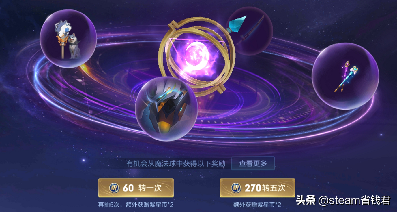 魔法球其实就是付费抽奖,玩家花费270积分抽奖5次可直接获得2个紫星币,同时抽奖还有几率获得1-10个紫星币。魔法球是获得紫星币最快的方法。