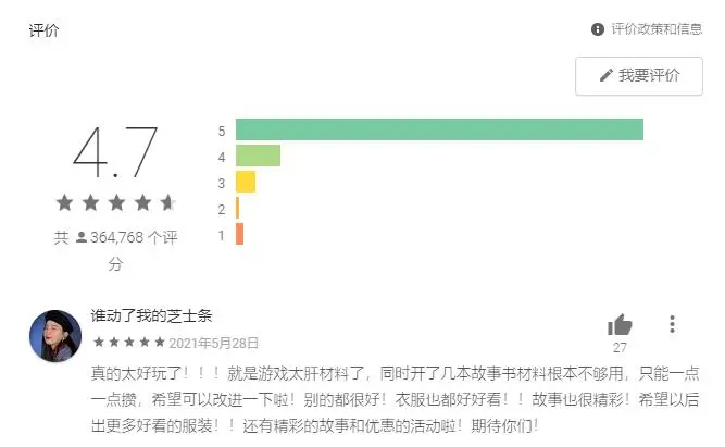 近期,由IGG自研游戏《时光公主》(英文名《Dress up!Time Princess》,亚洲部分地区译名《奇幻书境物语》)终于在5月底获得版号,开发团队也表示正努力加快国服上线的进度。这款墙内开花墙外香的女性向奇幻换装手游,深度融合了RPG与AVG游戏的玩法,在海外市场收获了如潮的好评,Google Play评分高达4.7分,而TapTap评分也达到了9.1分,而据了解,这款游戏今年1月海外月收入就接近2000万元。