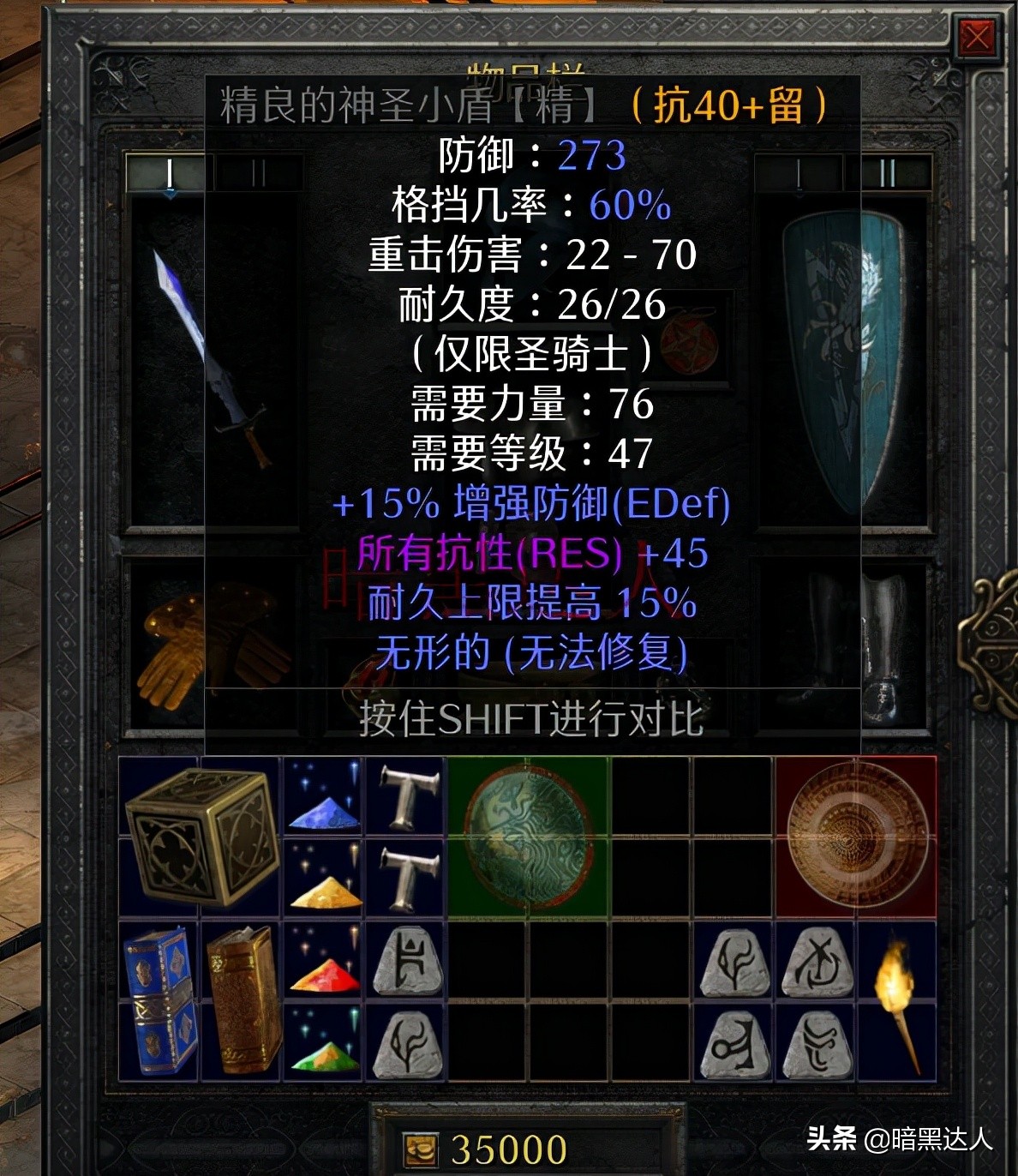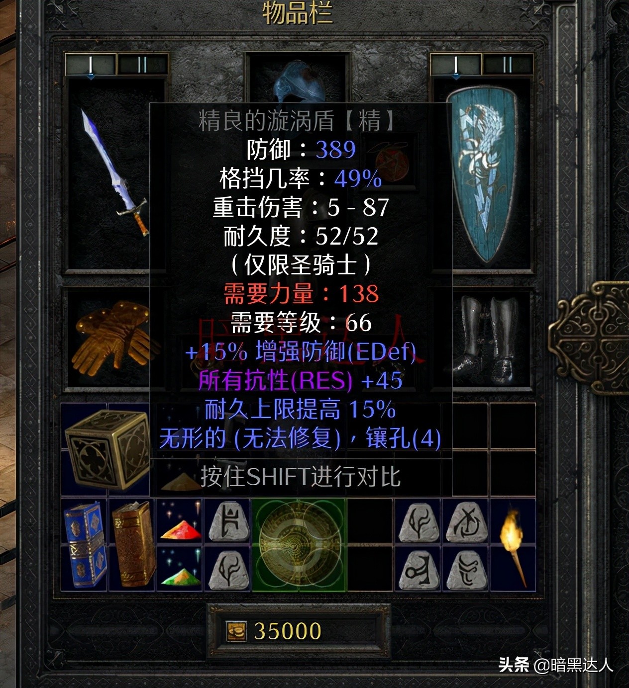 重制版无形防具BUG打孔已修复(老版本无形非超强灰色防具盒子打孔后防御额外提高50%),可直接选择无孔(第五幕任务打孔)或4孔的无形灰色品质的精英级别高抗性盾牌,带有15%增强防御的这种盾牌更好,结合成品中的260%加成,最高可获得275%“增强防御”加成。