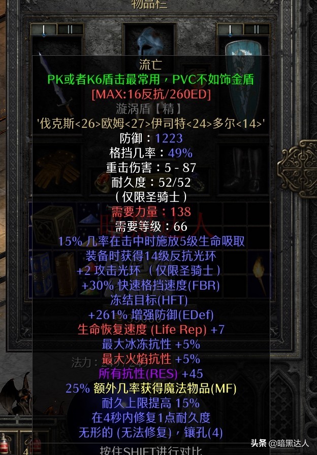 几种圣骑士专用精英盾中“神圣小盾”和“漩涡盾”(旋风盾)是最常见的两种“流亡”底材,“神圣小盾”格挡几率最高,力量需求也低,只是基础防御值较低,“漩涡盾”基础防御最高,重击伤害(圣骑士角色才看得到)上限也最高,但力量需求挺高。“神圣轻圆盾”和“萨卡兰姆盾牌”相对这两个盾牌都没什么突出优势,实在没刷到合适的前两种盾牌,也可选择防御和抗性较高的后两种。