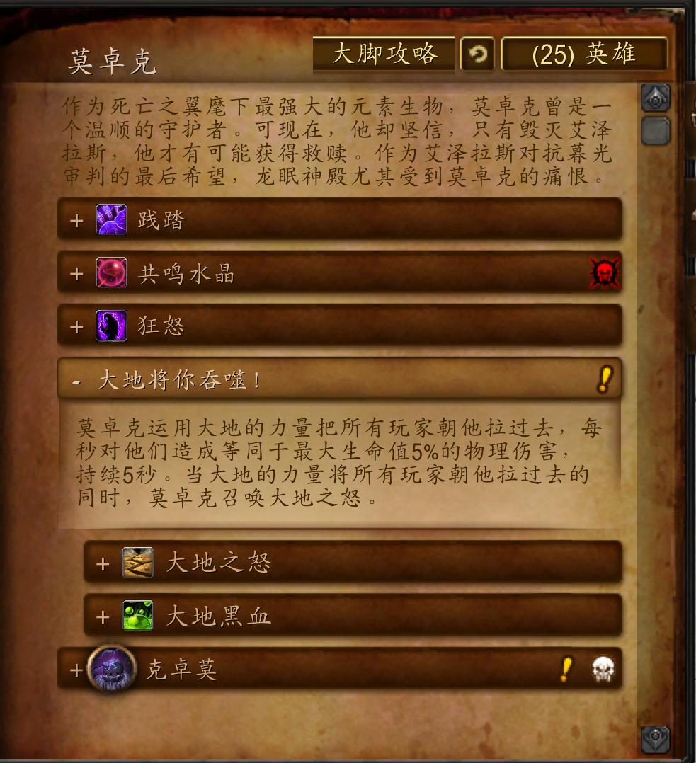 作为死亡之翼麾下最强大的元素生物,莫卓克曾是一个温顺的守护者。可现在,他却坚信,只有毁灭艾泽拉斯,他才有可能获得救赎。作为艾泽拉斯对抗暮光审判的最后希望,龙眠神殿尤其受到莫卓克的痛恨。