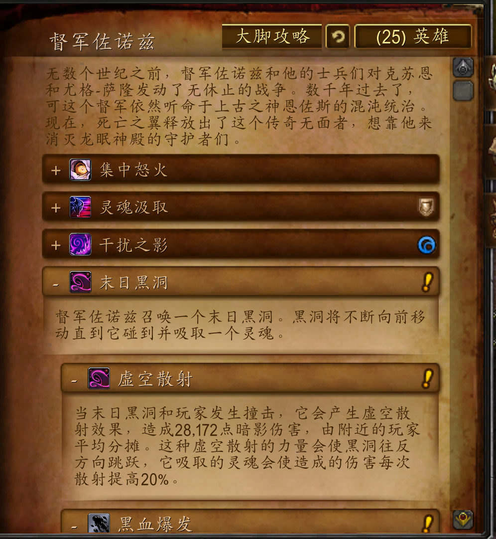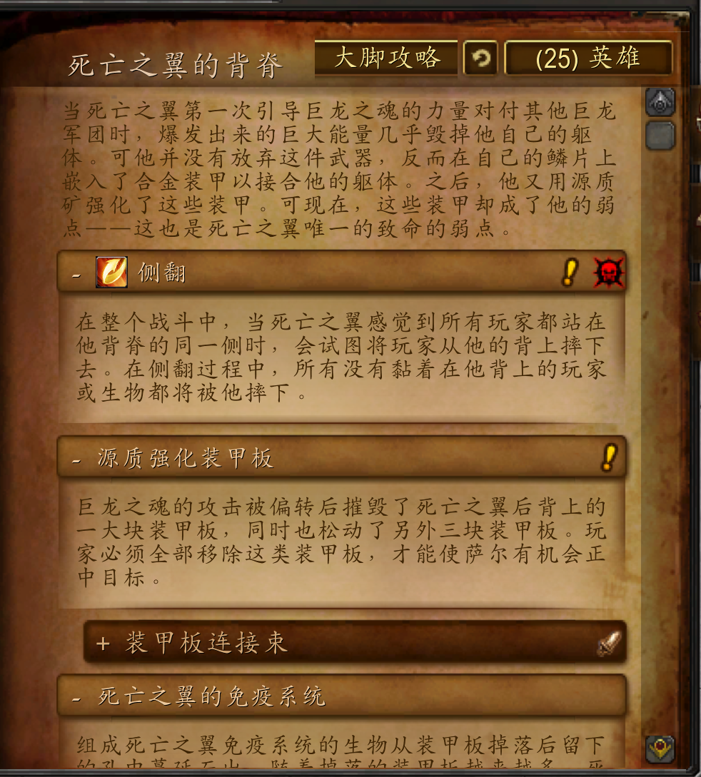 当死亡之翼第一次引导巨龙之魂的力量对付其他巨龙军团时。爆发出来的巨大能量几乎毁掉他自己的躯体。可他并没有放弃这件武器,反而在自己的鳞片上嵌入了合金装甲以接合他的躯体。之后,他又用源质矿强化了这些装甲。可现在,这些装甲却成了他的弱点一一这也是死亡之翼唯一的致命的弱点。