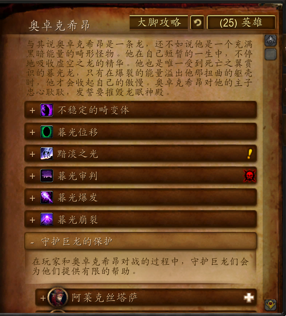 与其说奥卓克希昂是一条龙,还不如说他是一个充满黑暗能量的畸形怪物。他在自己短暂的一生中,不停地吸收虚空之龙的精华。他也是唯一受到死亡之翼赏识的暮光龙,只有在爆裂的能量溢出他那扭曲的躯壳时,他才会收起自己的傲慢。奥卓克希昂对他的主子忠心耿耿,发誓要摧毁龙眠神殿。