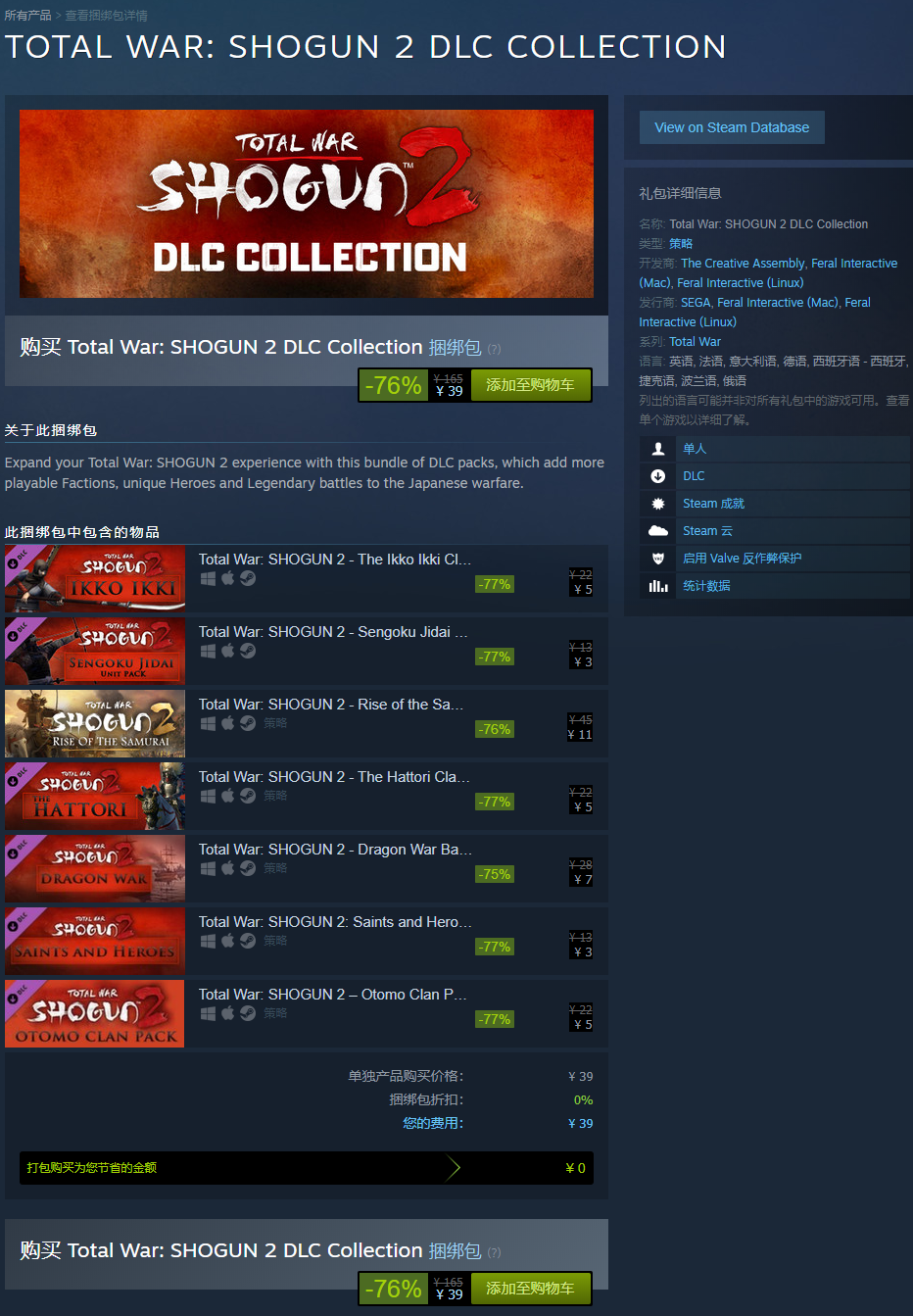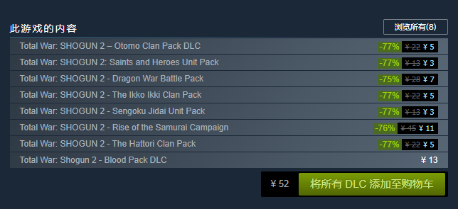 还有一个DLC全套的购买页面,推荐还是单个DLC批量选择入手,价格相同。如果购买了武士之殇再购买全套DLC会亏7元。