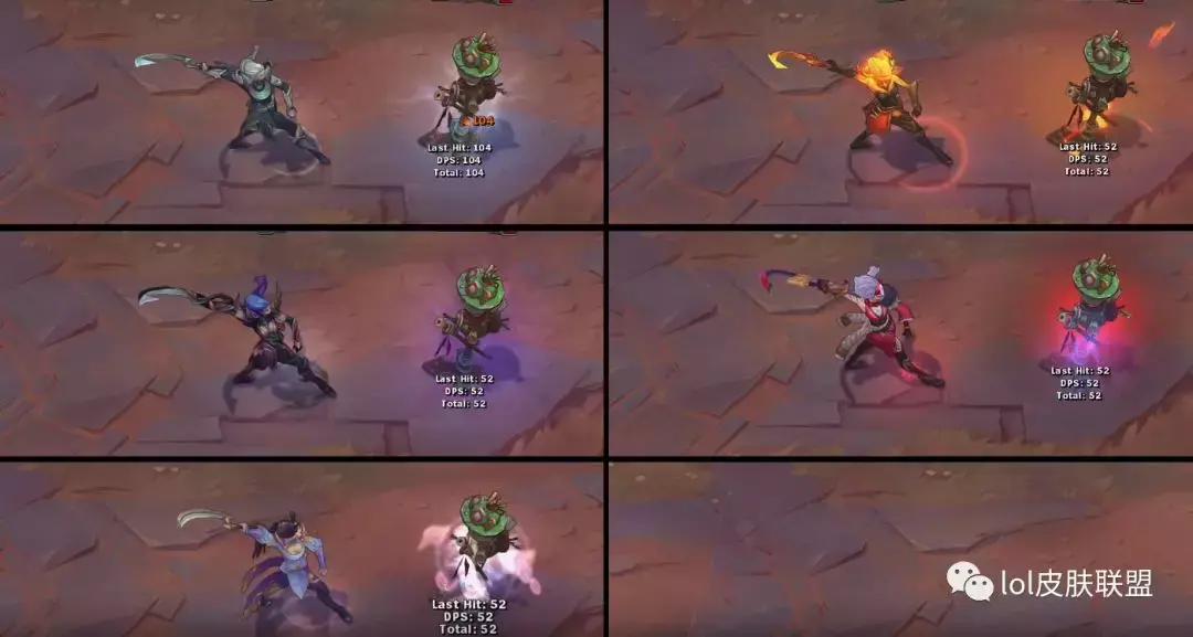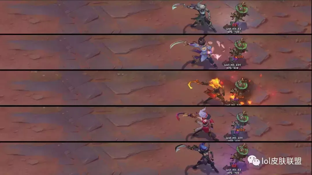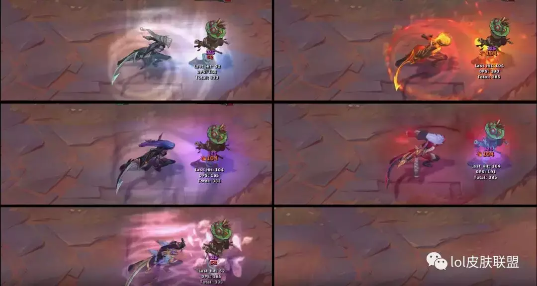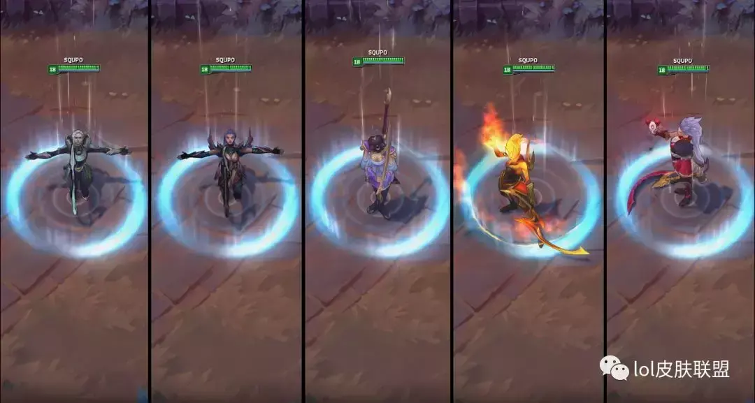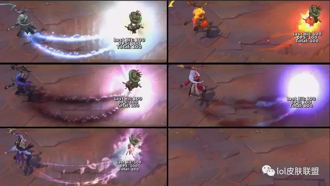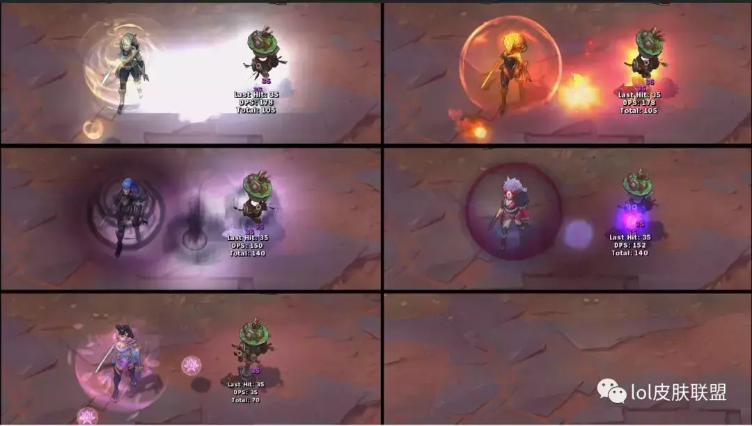 普攻方面,普攻的时候四款皮肤均带有特效,暗黑女武神的普攻特效光点很淡,也因为这款皮肤是暗色系的元素,因此并不是很显眼。其余的三款普攻特效都和皮肤自身的元素一致。