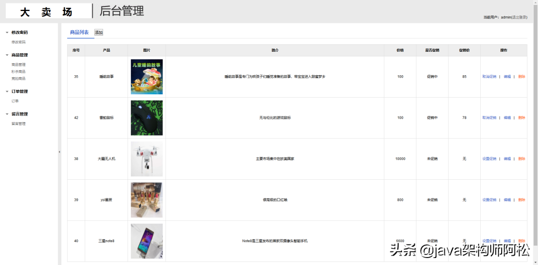 后台含发布商品、修改商品价格等功能: