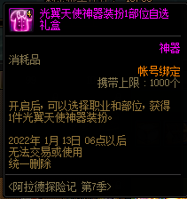 在本期阿拉德探险记中,除了高级探险家Lv100可以获得光翼天使神器装扮1部位自选礼盒外,还可以获得总计7个次元玄晶和25个次元玄晶碎片,可以用来升级神器装扮。