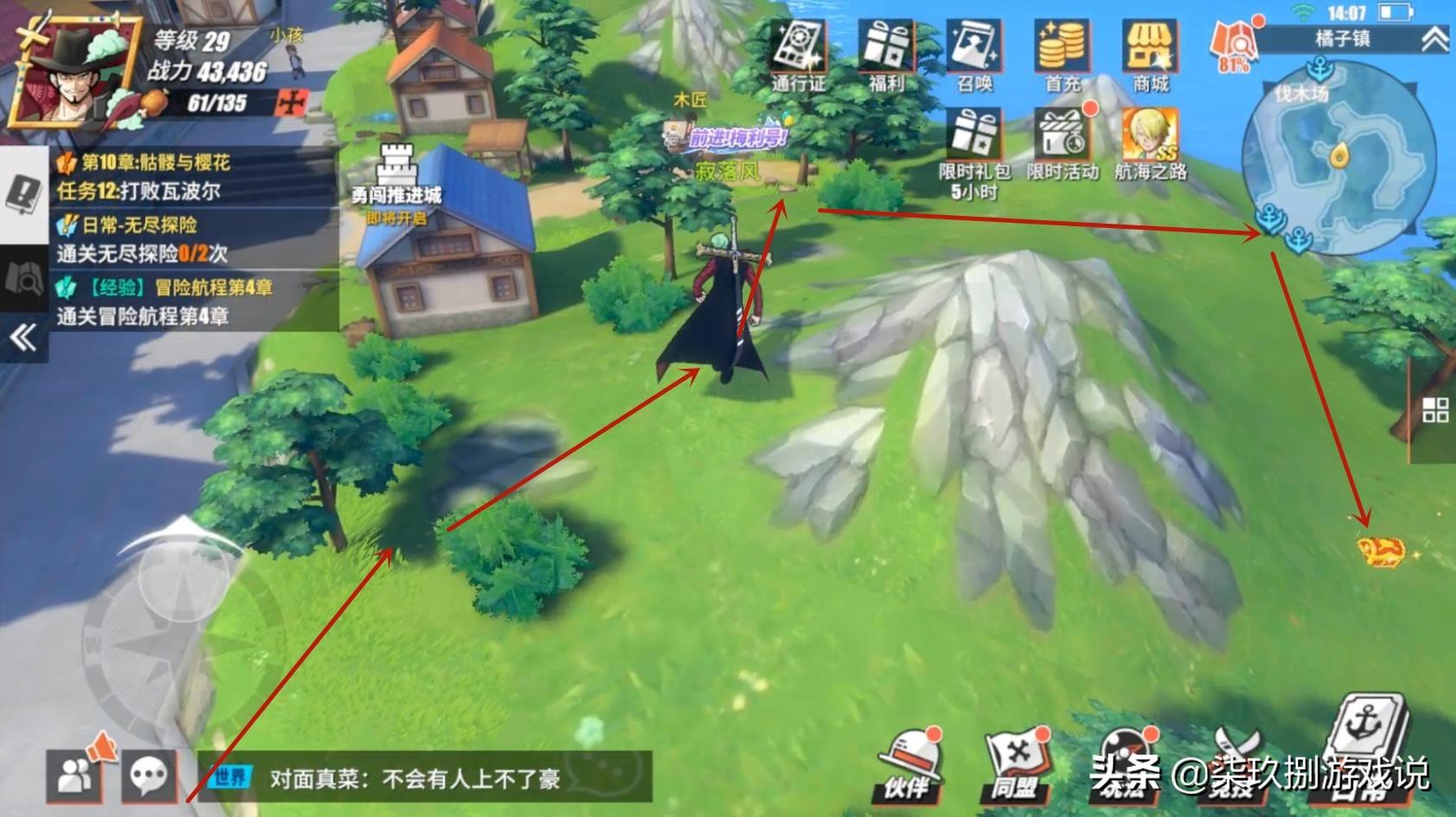 最后一个“镇子东南边的小山丘下”则藏得比较隐秘,需要玩家按照上图路线才能前往到其指定位置处。三个宝箱依次获得的奖励是: