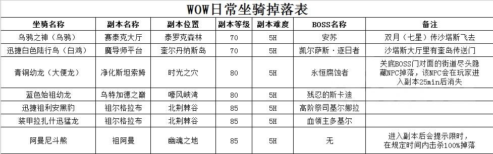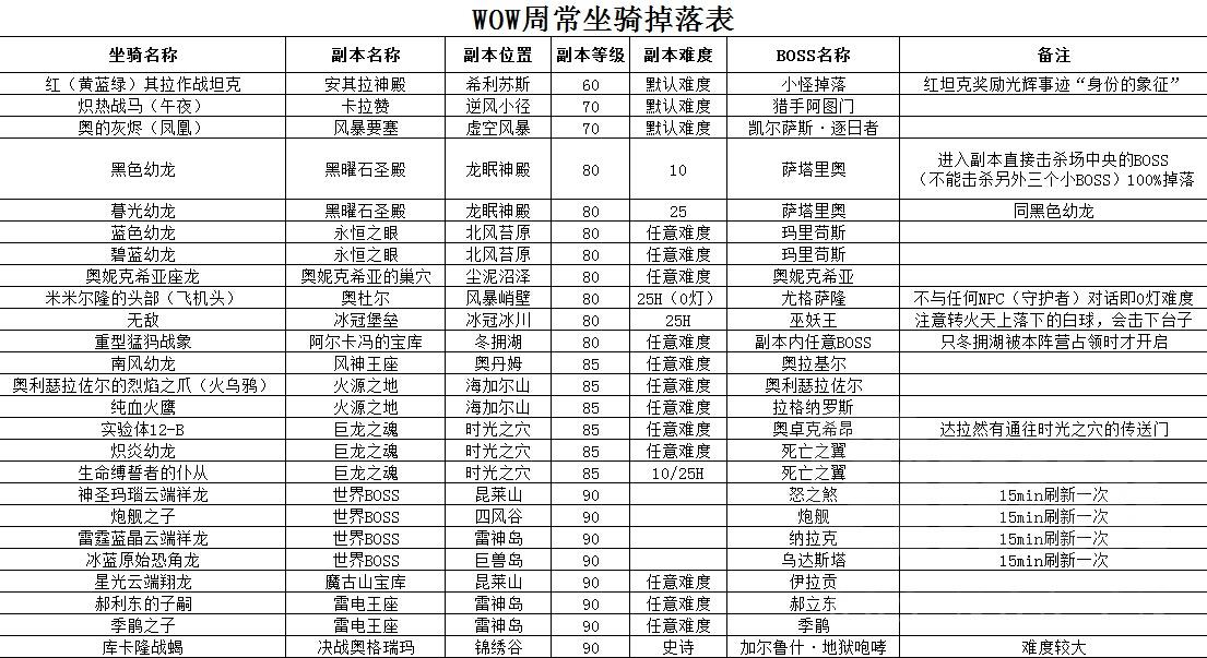 本贴只包括0到90级(不包括德拉诺内容),只包括掉落类坐骑(不包括牌子兑换类)