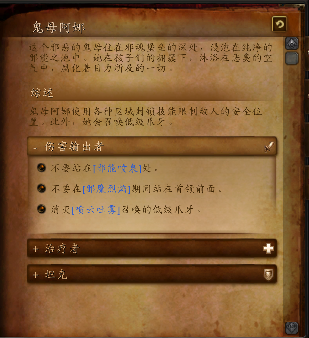 这个邪恶的鬼母住在邪魂堡垒的深处,浸泡在纯净的邪能之池中。她在孩子们的拥簇下,沐浴在恶臭的空气中,腐化着目力所及的一切。