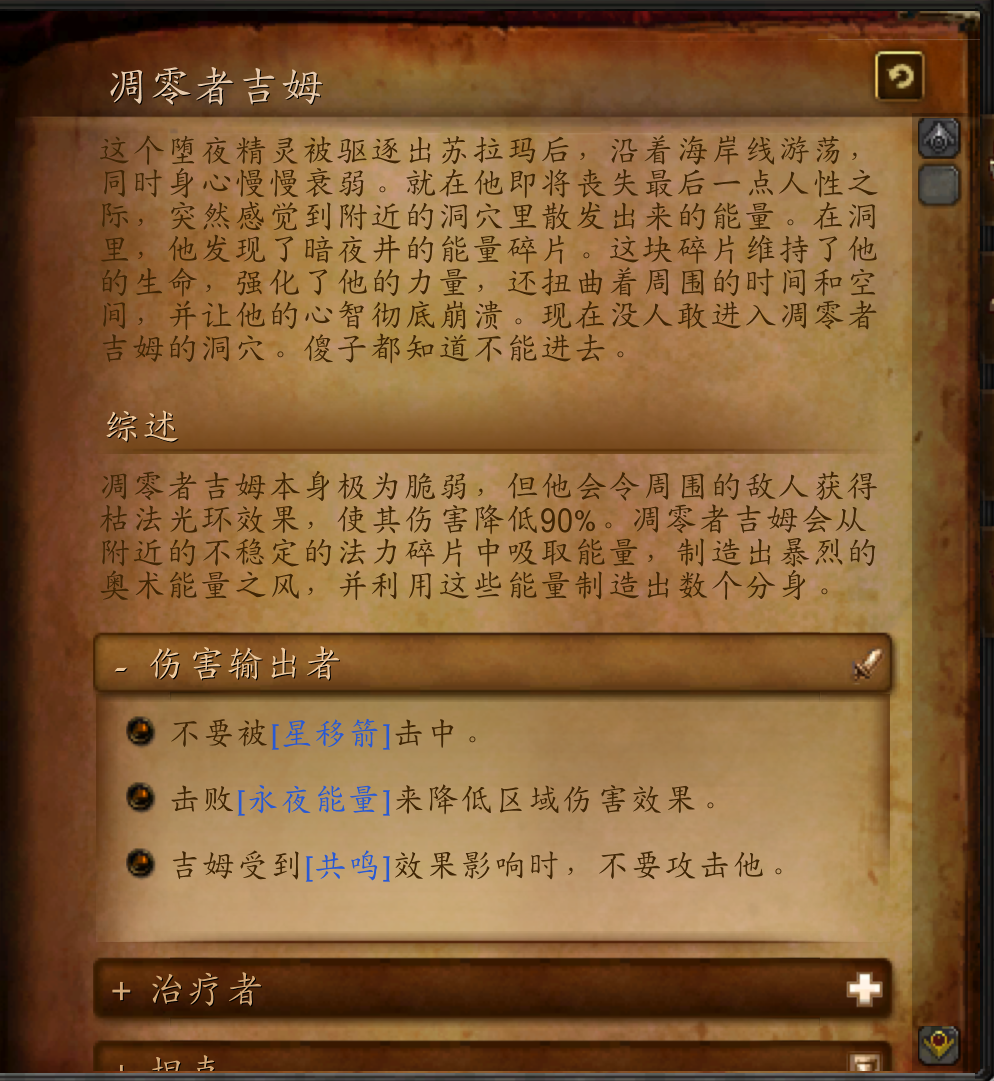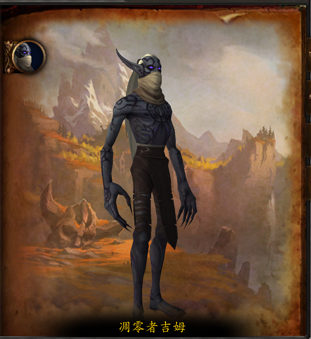 这个堕夜精灵被驱逐出苏拉玛后,沿着海岸线游荡,同时身心慢慢衰弱。就在他即将丧失最后一点人性之际,突然感觉到附近的洞穴里散发出来的能量。在洞里,他发现了暗夜井的能量碎片。这块碎片维持了他的生命,强化了他的力量,还扭曲着周围的时间和空间,并让他的心智彻底崩溃。现在没人敢进入凋零者吉姆的洞穴。傻子都知道不能进去。