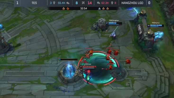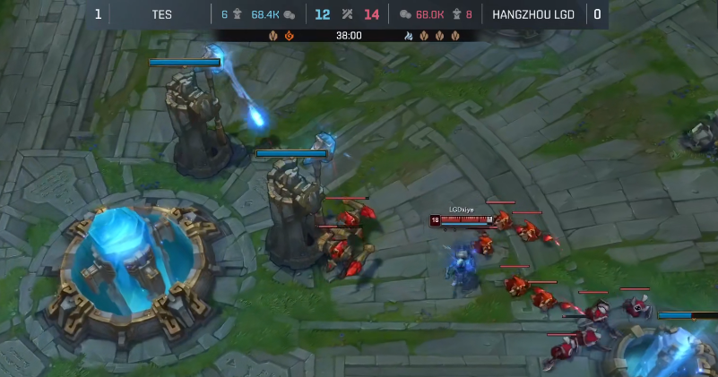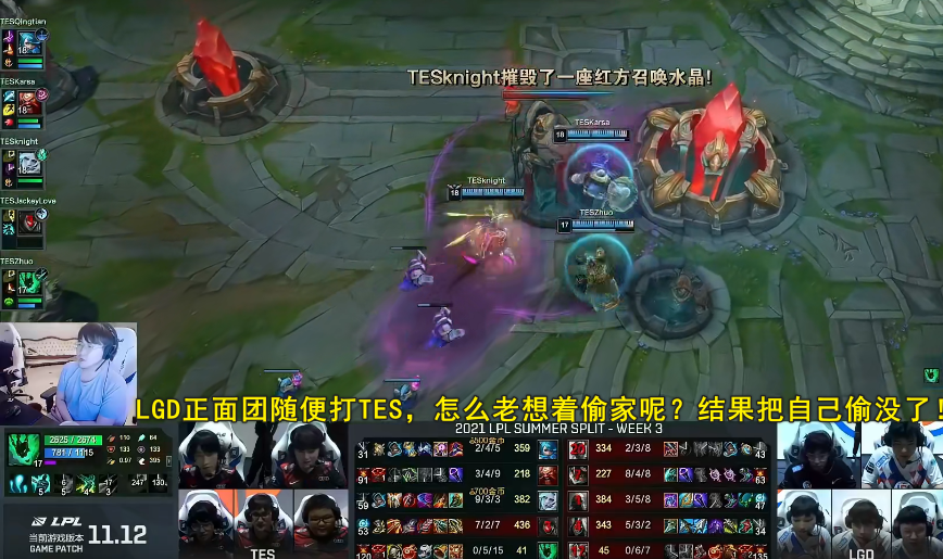 比赛来到40分钟,TES选择打大龙,LGD上中两人“偷家”,其他人则负责拖住TES的人,但Knight早已在基地守着,LGD“偷家”失败,接连几次都没能成功,LGD似乎失去了耐心,选择正面跟TES硬刚,结果就是团灭。