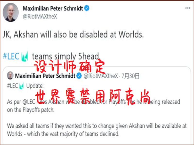 LCS季后赛还在这个星期就开打了,放出能带来诸多变数的阿克尚确实不好,相信各个战队的选手也来不及上手阿克尚。而LEC则是也只有两个星期就要开赛了。但是现在的版本为11.15,世界赛版本应该是11.18,过去三个版本,阿克尚怎么也该解封,能够登上全球总决赛才对。但是就在昨天,拳头设计师发推特表示,全球总决赛也会禁用阿克尚。随后便有网友询问做出如此决定。设计师回答的大概意思为,因为四大赛区已经有两大联赛确定在季后赛中ban掉阿克尚,其他两大赛区也不知道会不会启用,他们无法获得足够的数据,来针对阿克尚的赛场表现做出有效的平衡。如果很多赛区都禁用阿克尚,那么他们就会不知道阿克尚的真实强度。