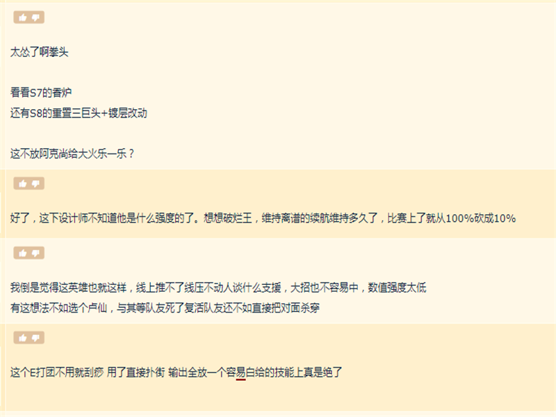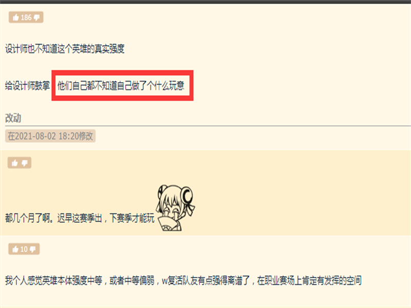 虽然说阿克尚的禁用可以参考季中赛破败之王与格温的待遇,但是世界赛到现在相隔了三个版本,还是ban掉可以说生来就是为了上演孤胆英雄,观赏性拉满的阿克尚,属实会让比赛少了很多看点。而有网友也从设计师的回复中发现:他们自己都不知道自己做了个什么玩意。可以说总结得十分到位。设计师似乎常常真的如同doinb经常吐槽的一般,都是云玩家。