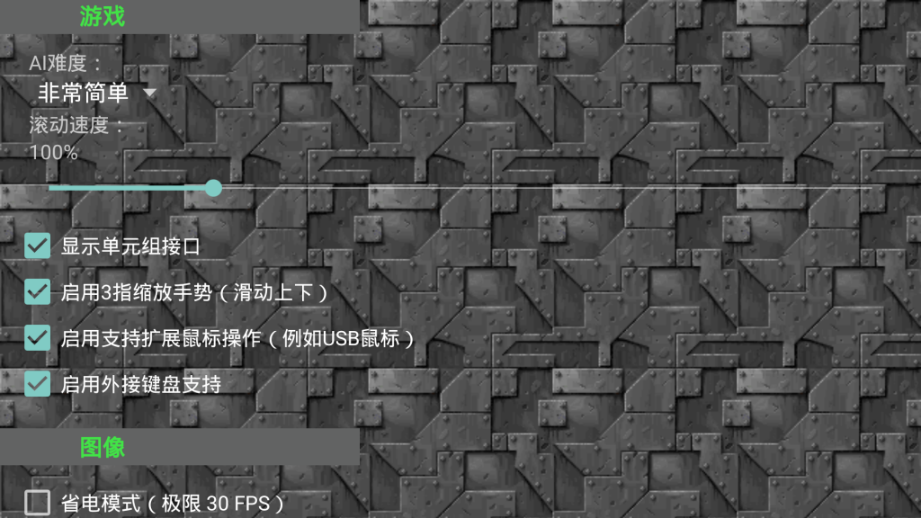 在游戏的设置里面你可以自由调整 AI 的难度,从非常简单到地狱模式一共有六个难度可供选择,而且游戏支持扩展鼠标操作和外接键盘,你也可以调整滚动速度并对图像进行设置。