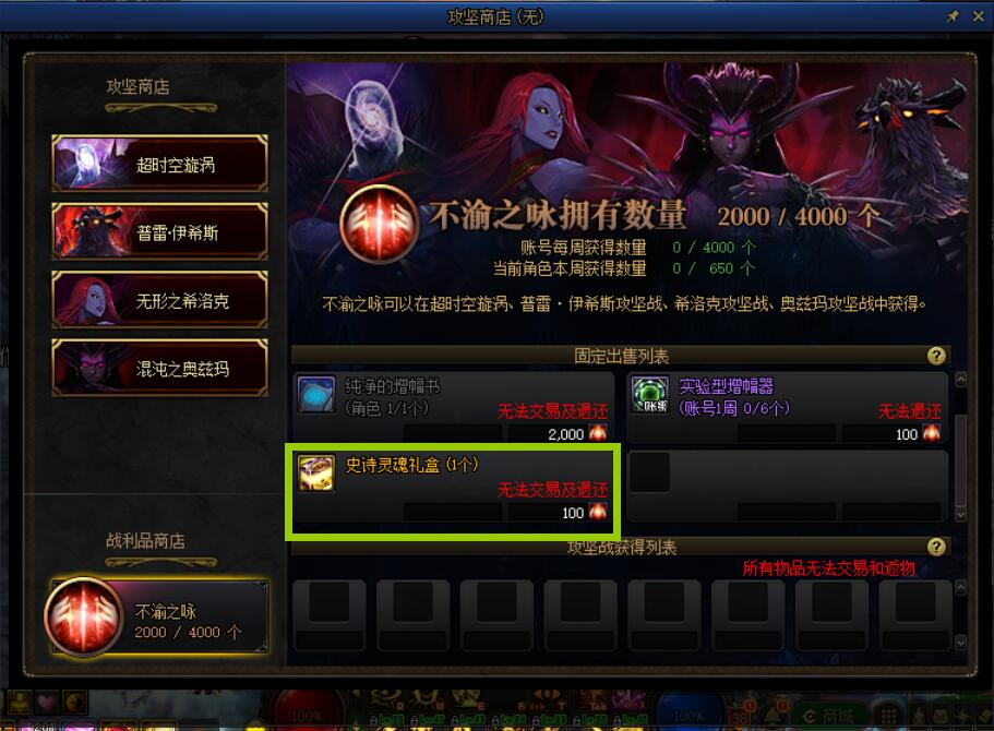 玩家可以在不渝之咏商店中使用100不渝之咏兑换 [史诗灵魂礼盒(1个)],没有兑换次数限制,获得的史诗灵魂可以通过NPC商店1:1兑换成灵魂之源。