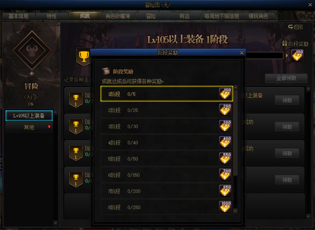 在冒险团成就中的冒险- [Lv105以上装备]标签页,阶段奖励可以获取大量金绿柱石。