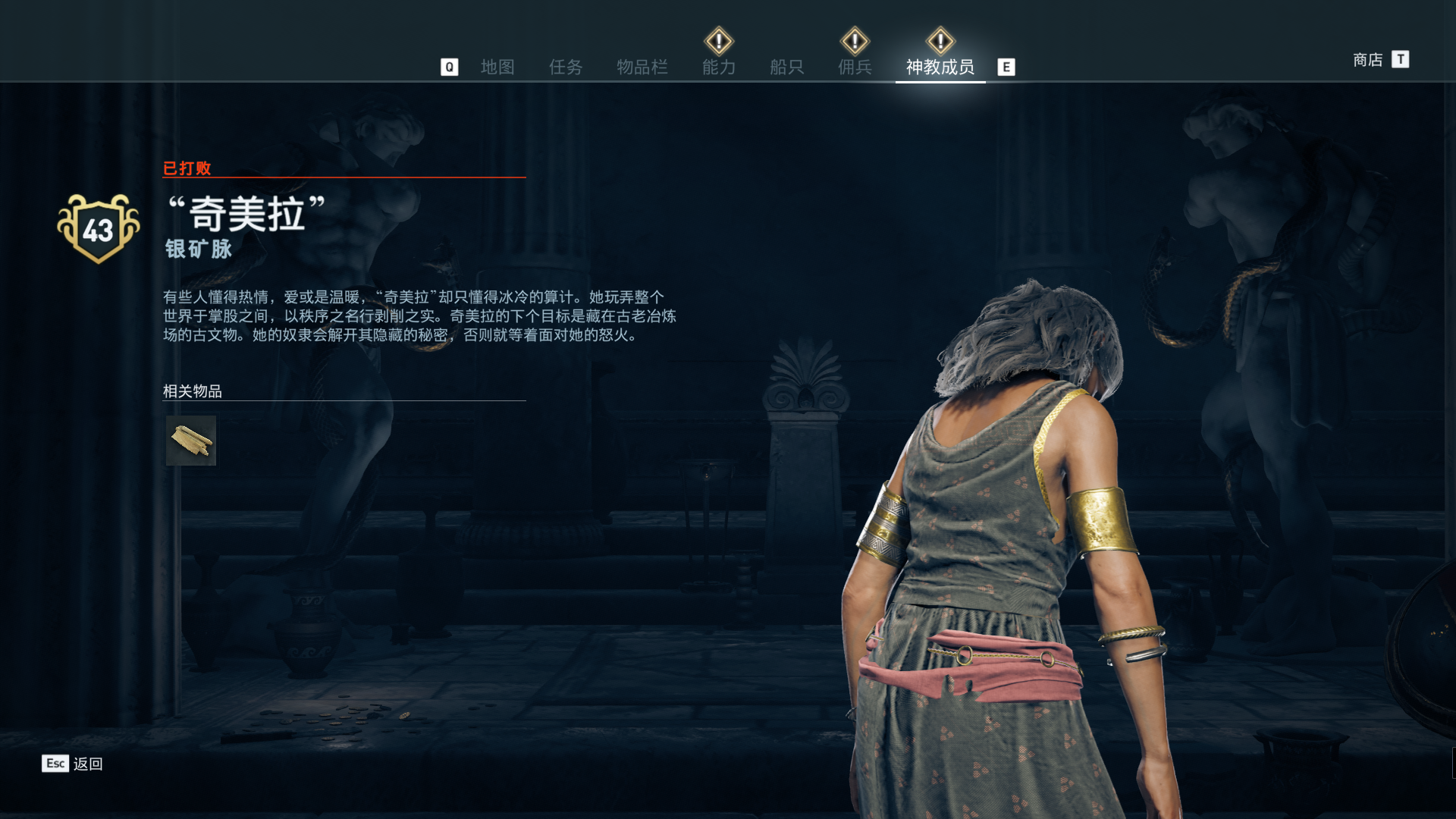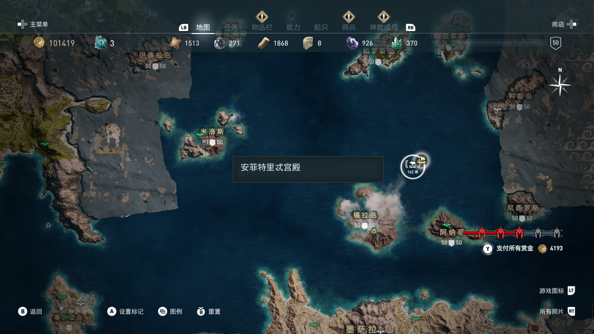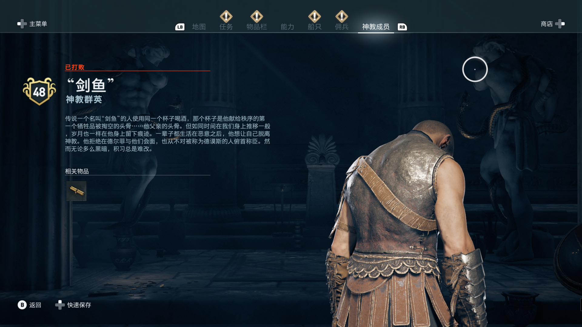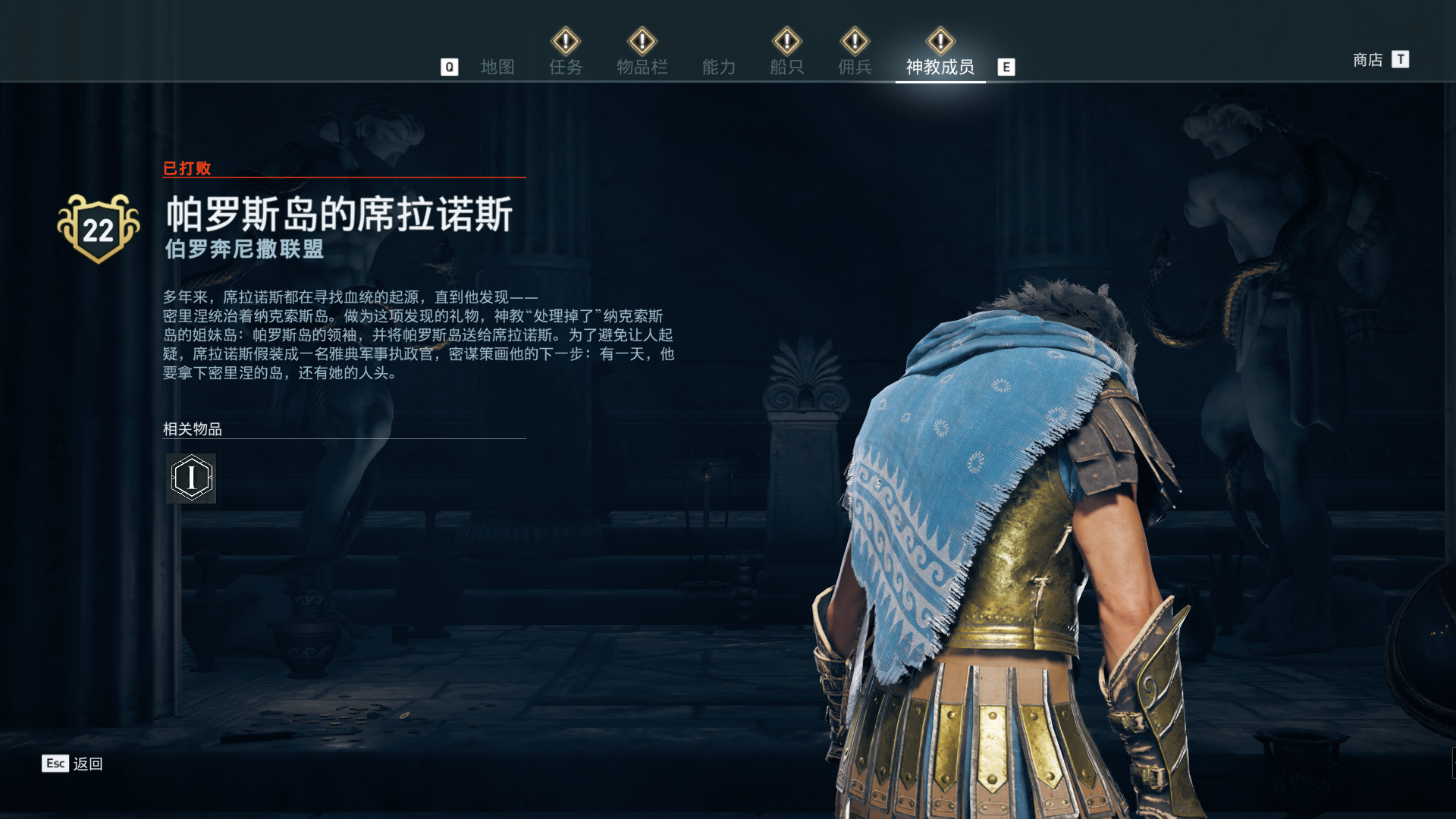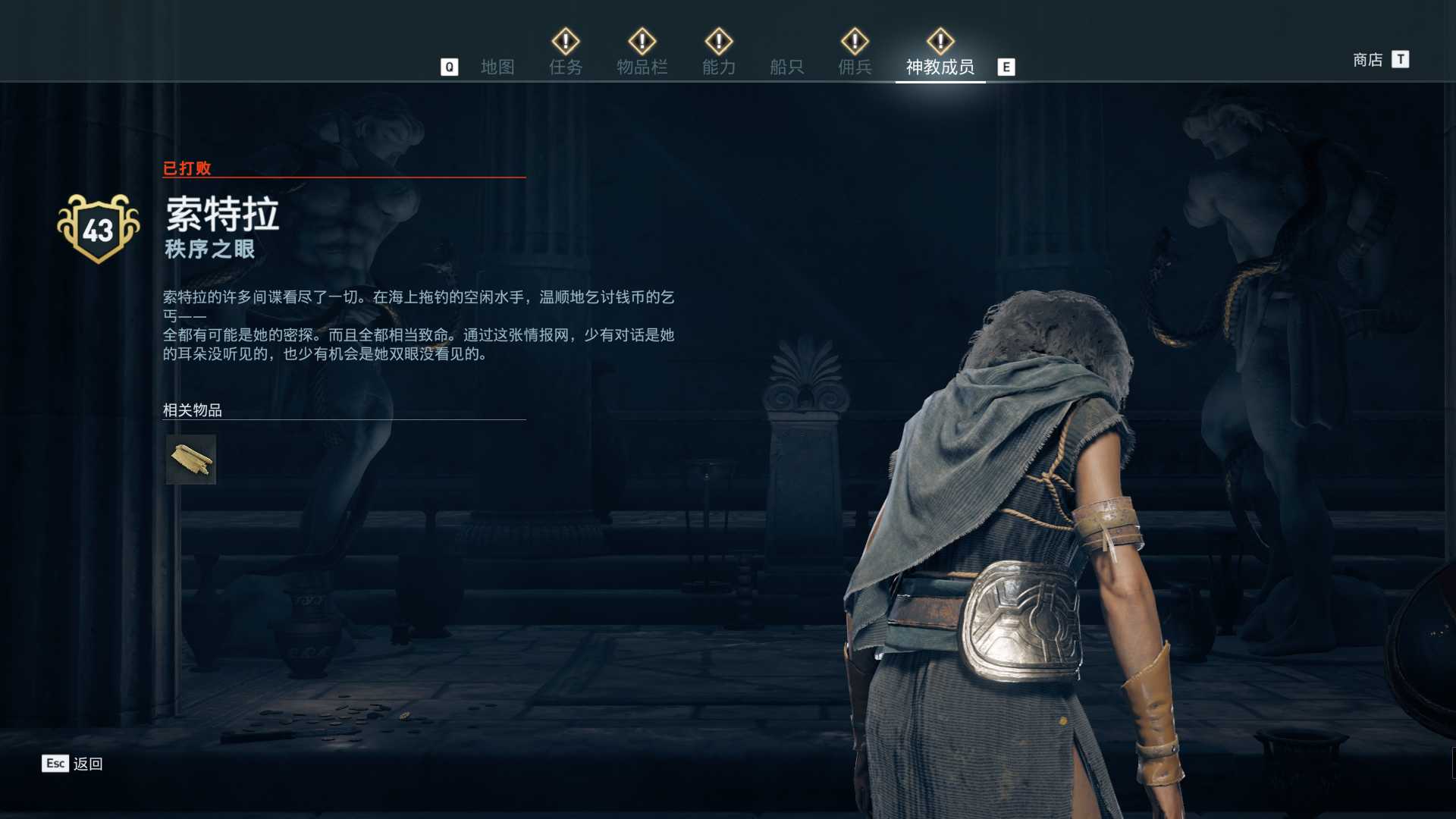 线索:这个是最难找的之一。从上一个任务得知“神教成员在锡拉岛的遗迹沉没”,在锡拉岛和科斯岛之间,有个叫“安菲里斯忒宫殿”的地方,靠近显示附近有神教成员线索。