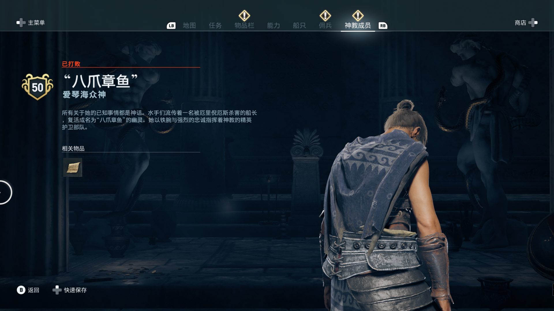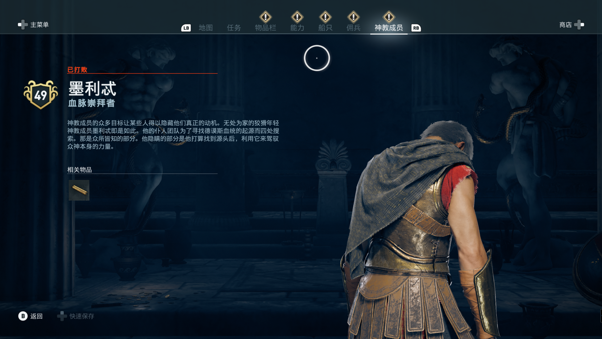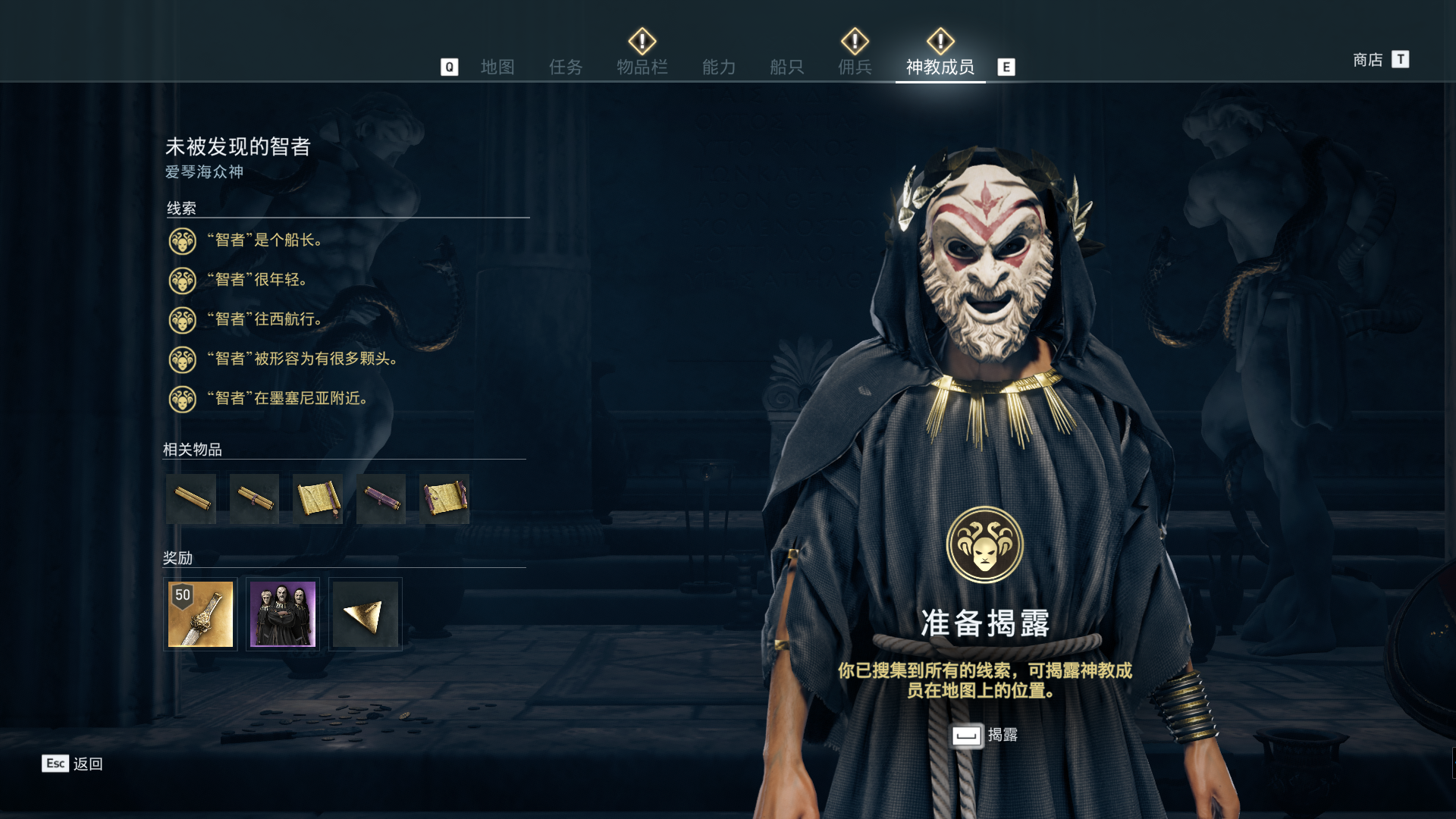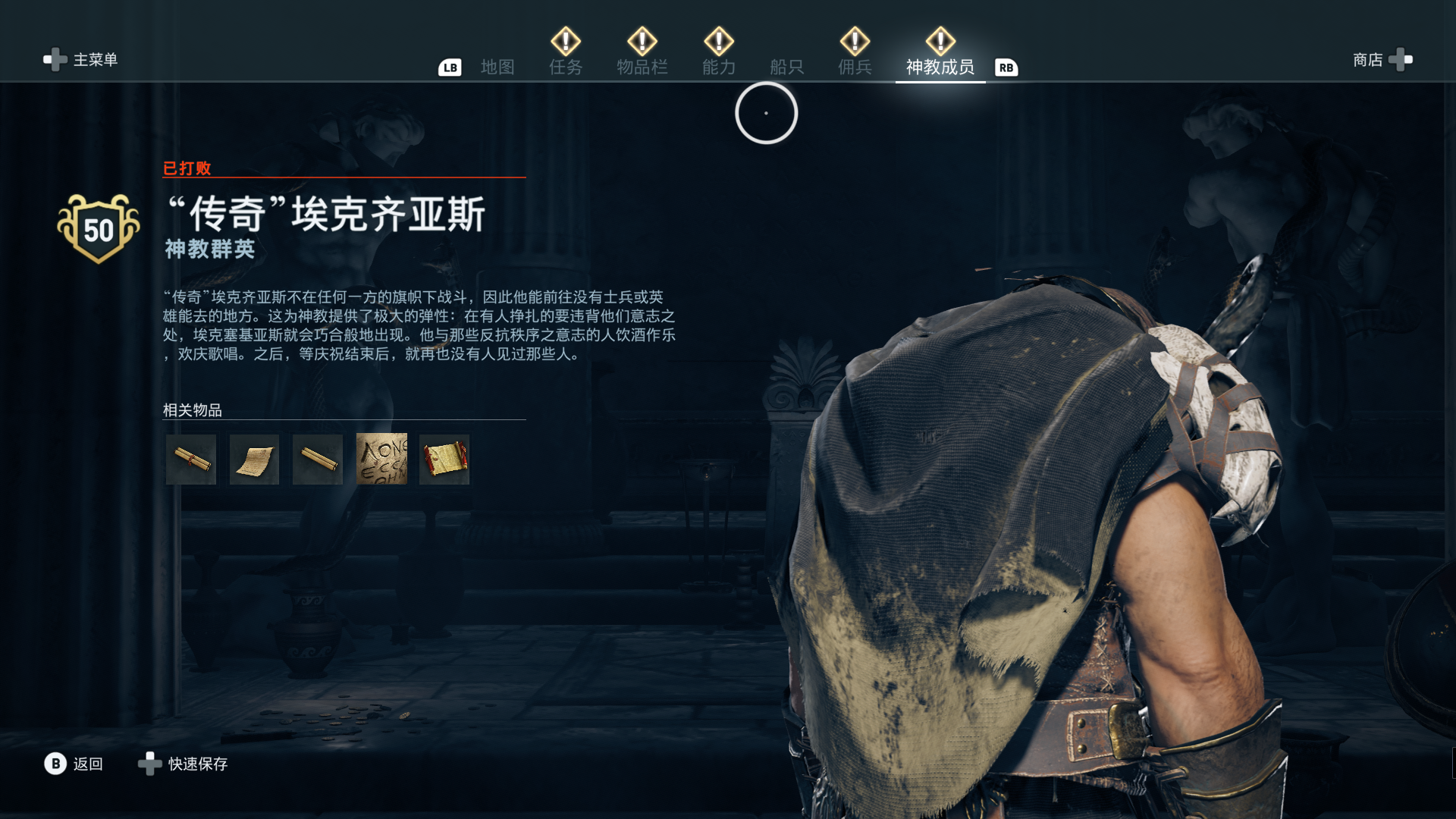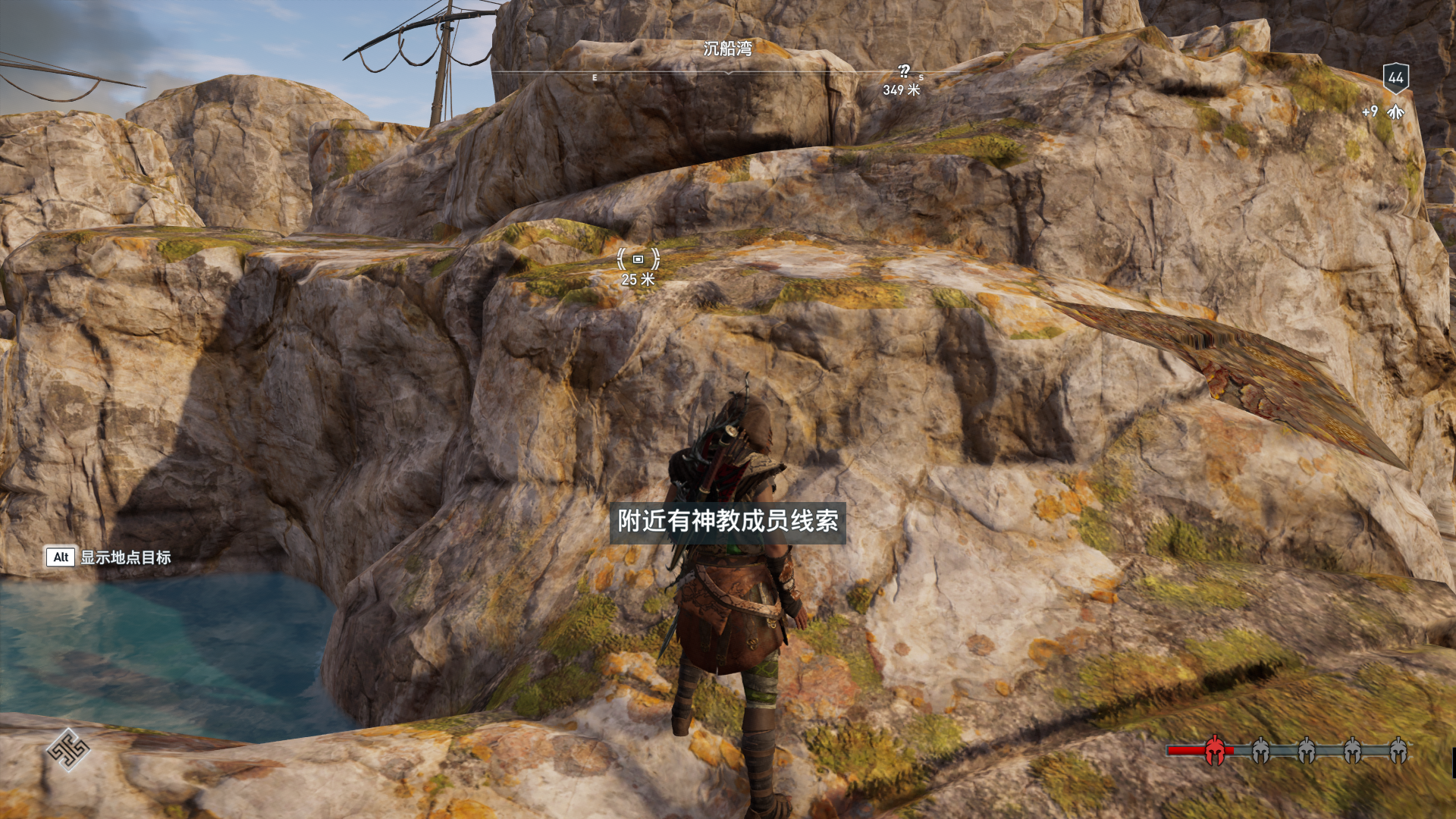 线索:这个是最难找的之一。从上一个任务得知“神教成员在锡拉岛的遗迹沉没”,在锡拉岛和科斯岛之间,有个叫“安菲里斯忒宫殿”的地方,靠近显示附近有神教成员线索。