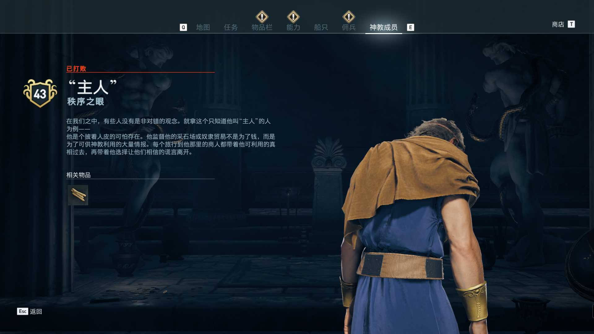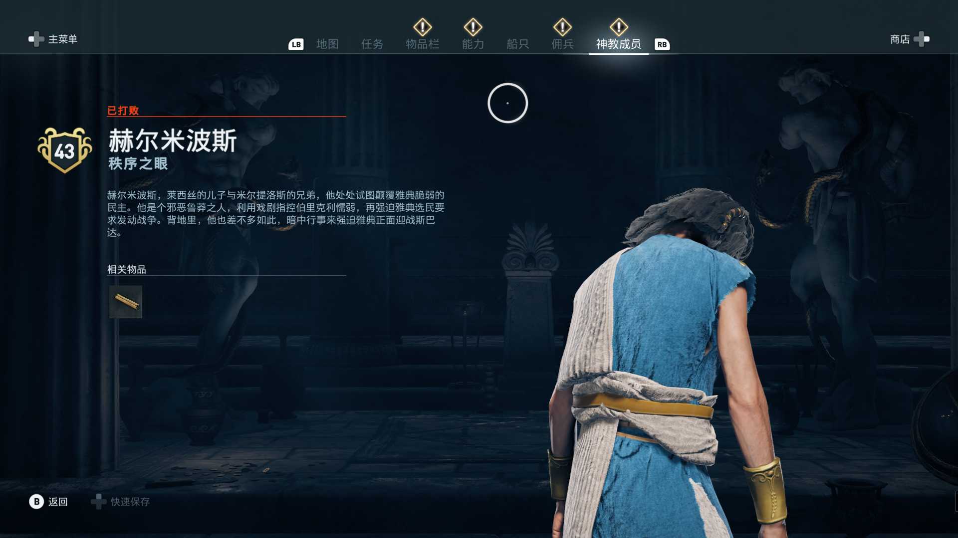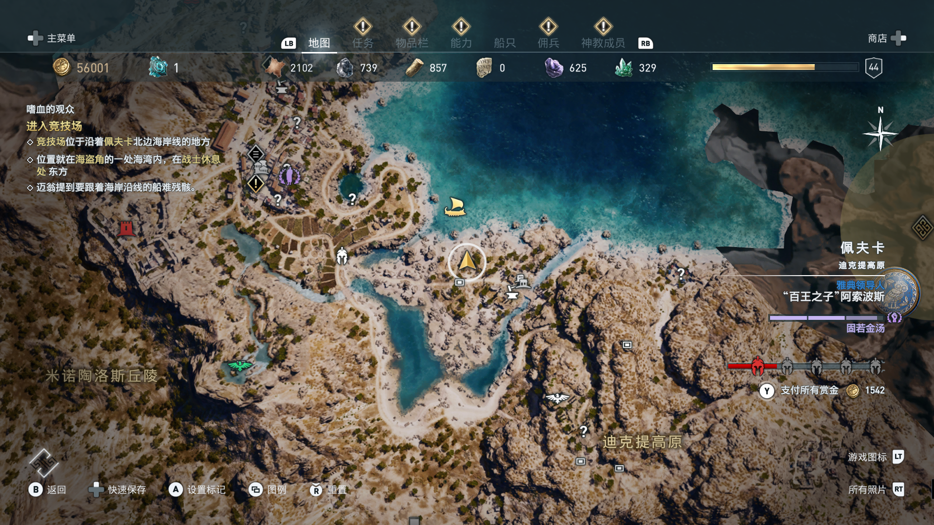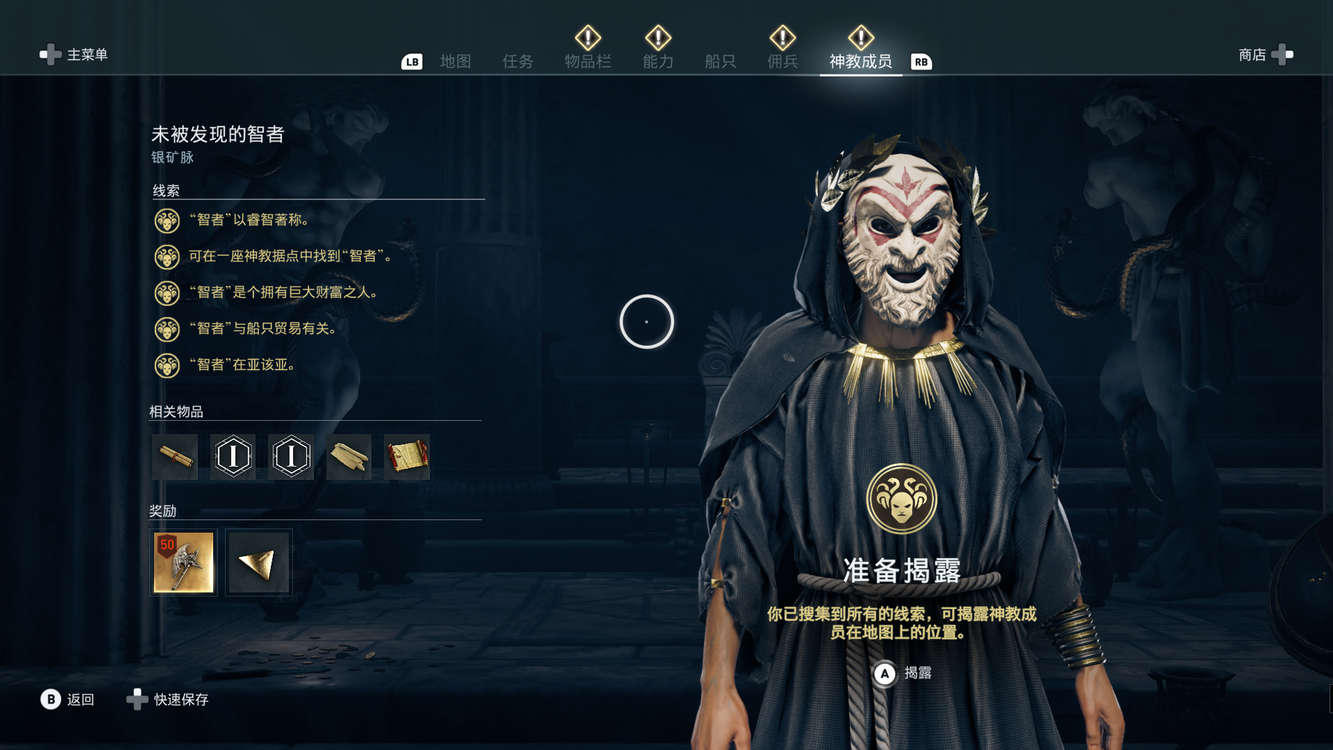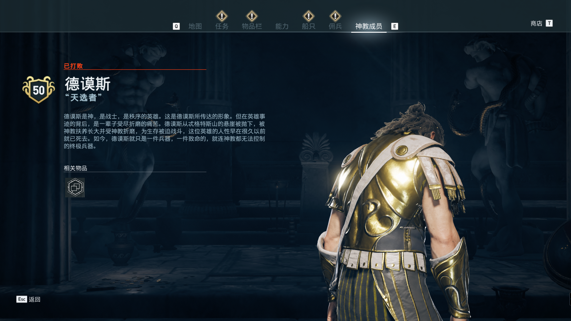 线索:这个是最难找的之一。从上一个任务得知“神教成员在锡拉岛的遗迹沉没”,在锡拉岛和科斯岛之间,有个叫“安菲里斯忒宫殿”的地方,靠近显示附近有神教成员线索。