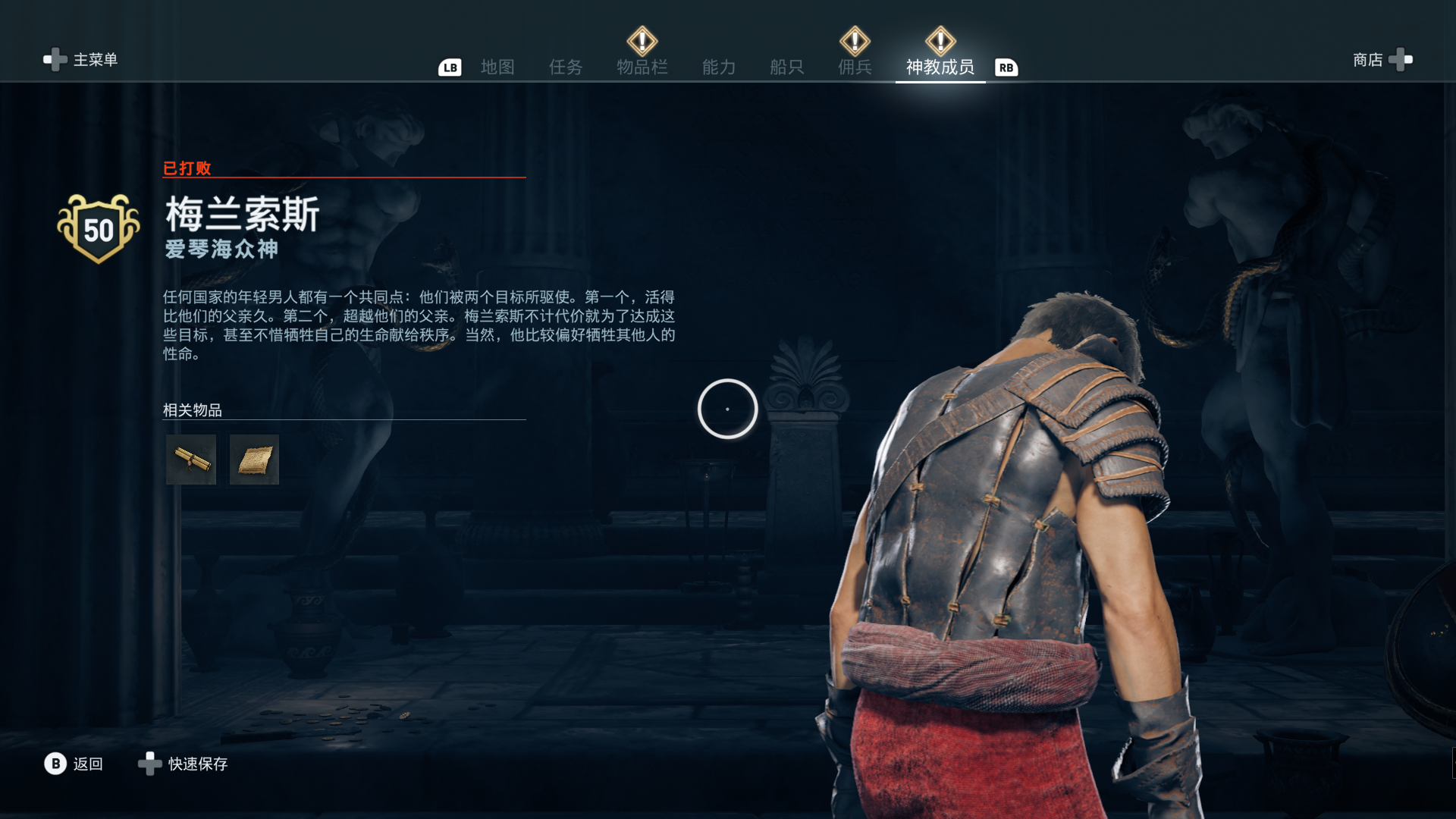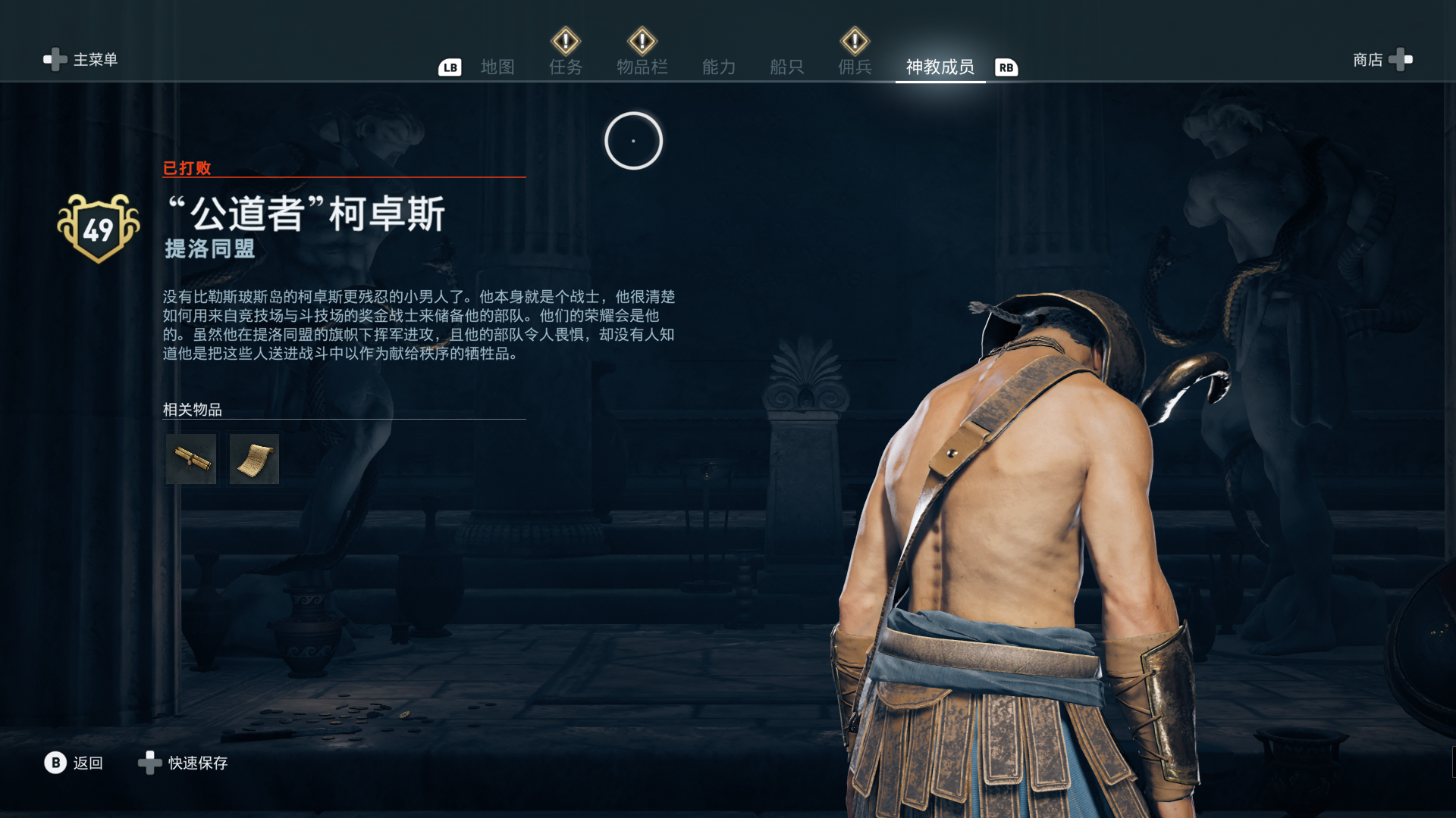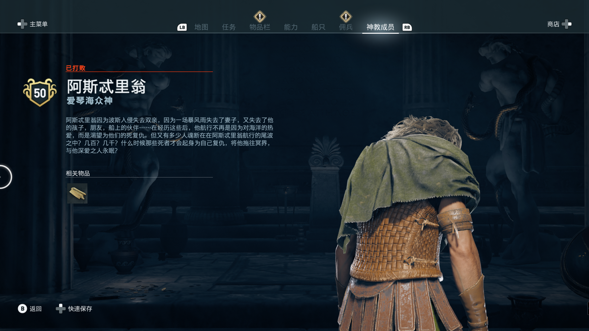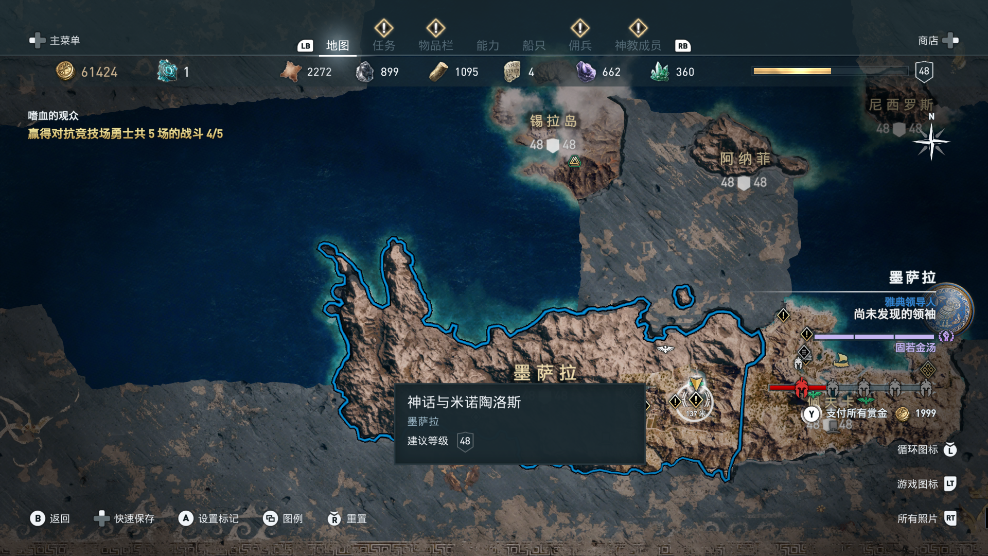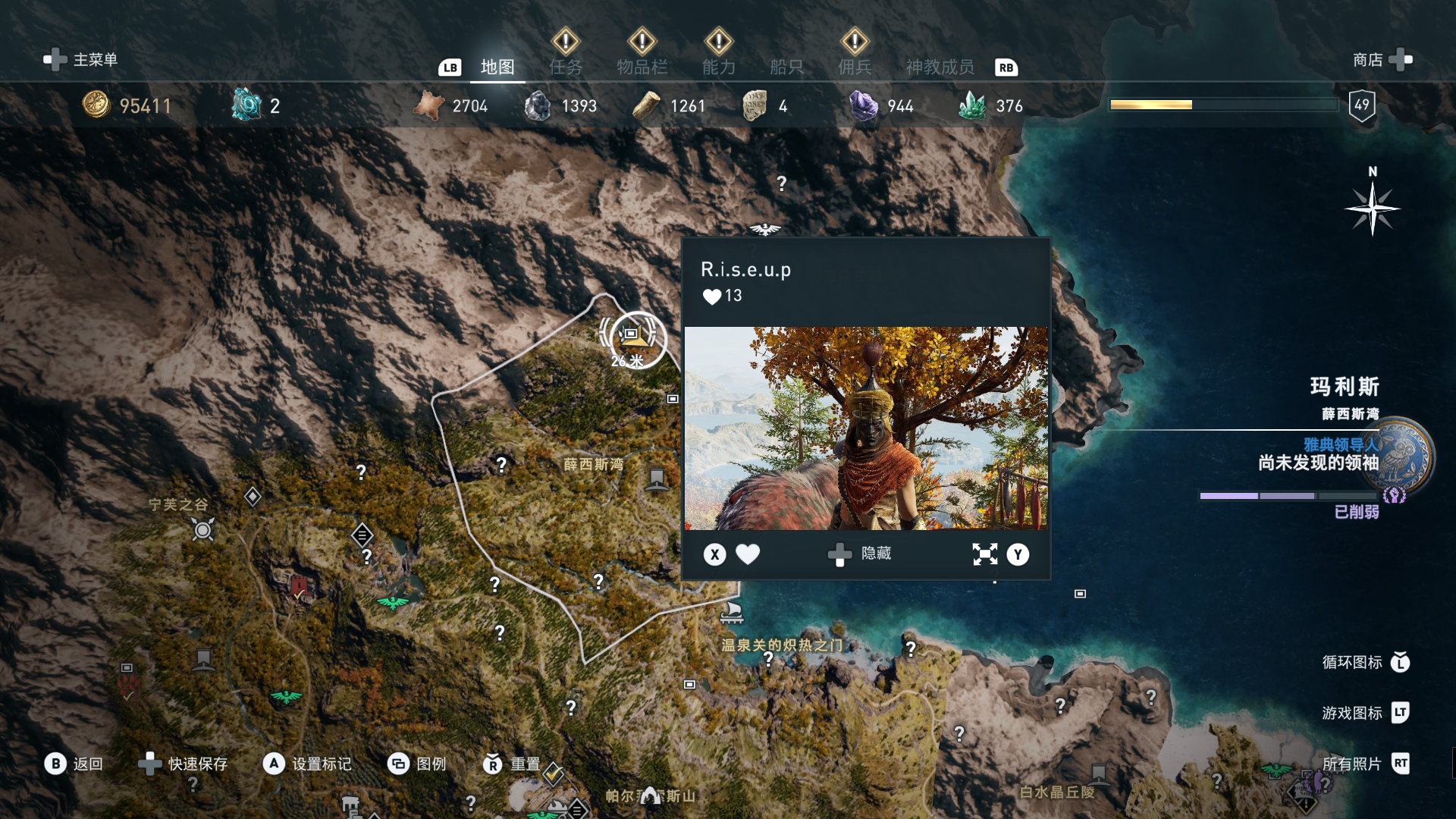 线索:这个是最难找的之一。从上一个任务得知“神教成员在锡拉岛的遗迹沉没”,在锡拉岛和科斯岛之间,有个叫“安菲里斯忒宫殿”的地方,靠近显示附近有神教成员线索。