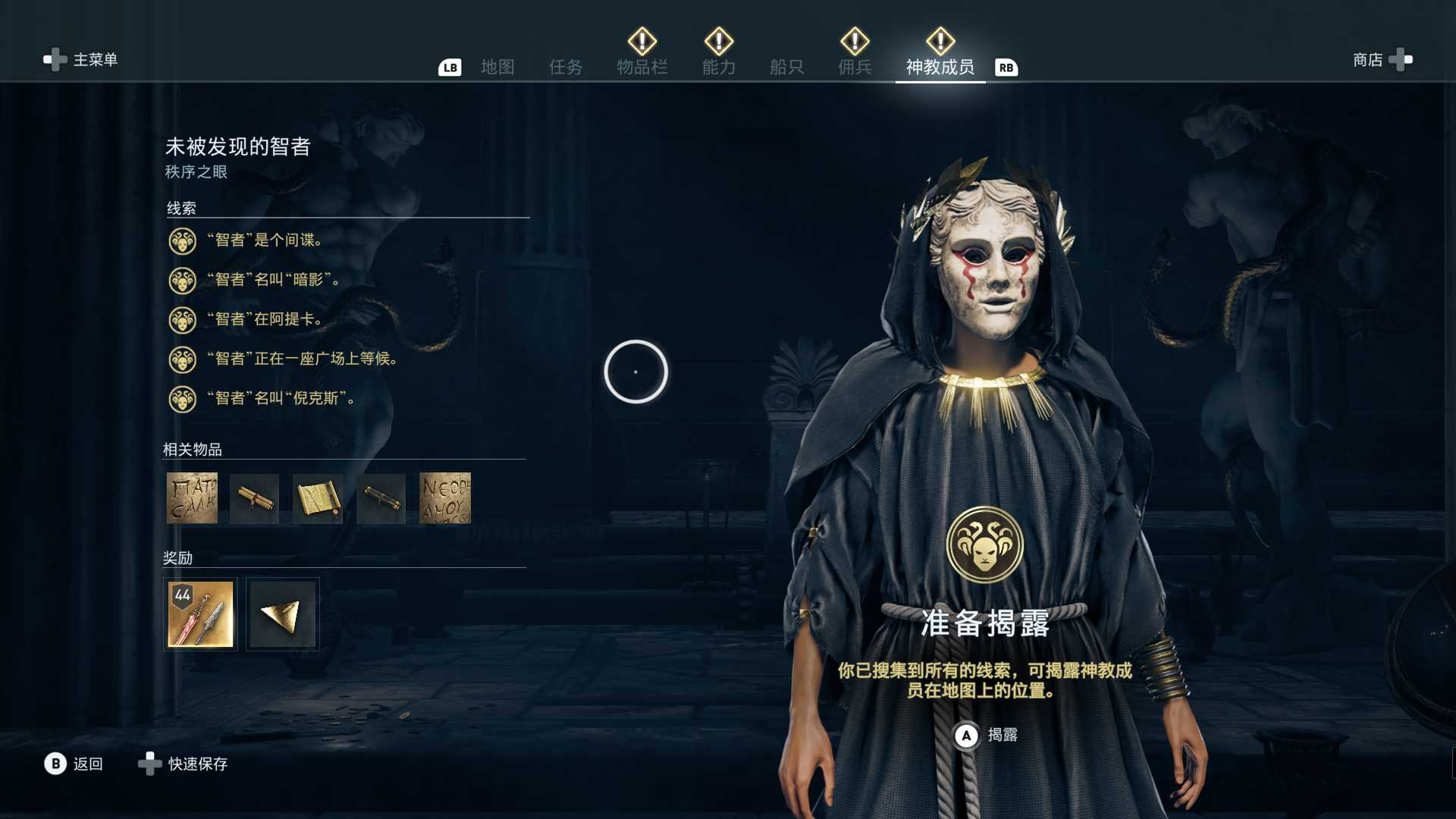 线索:从上一个任务得知“莫萨拉的领袖是神教成员的父亲”,杀死领袖,得到“给儿子的信”,之后揭开成员的位置。