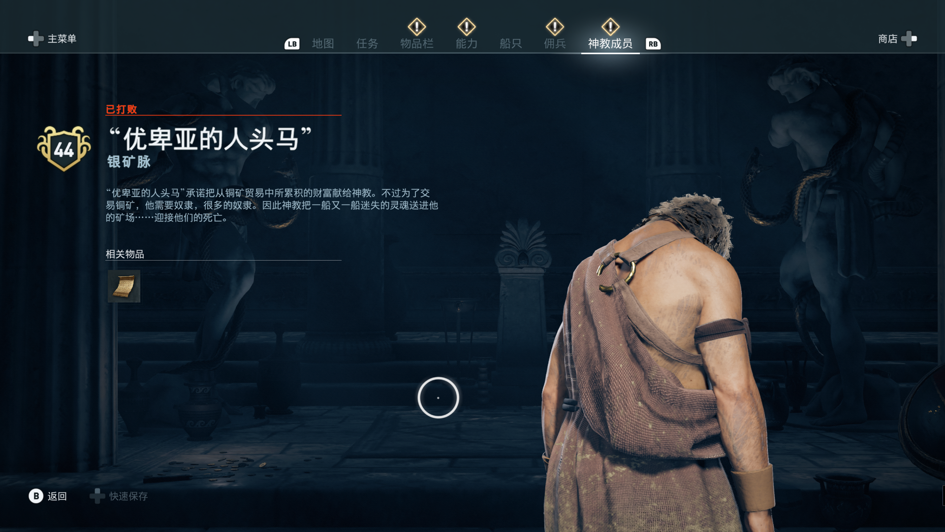 线索:在米克诺斯岛做支线“M的命案”可以触发,或者直接用鹰眼勘察可以发现岛上不少神教守卫,其中一个叫“银色狮鹫”的士兵就是目标。