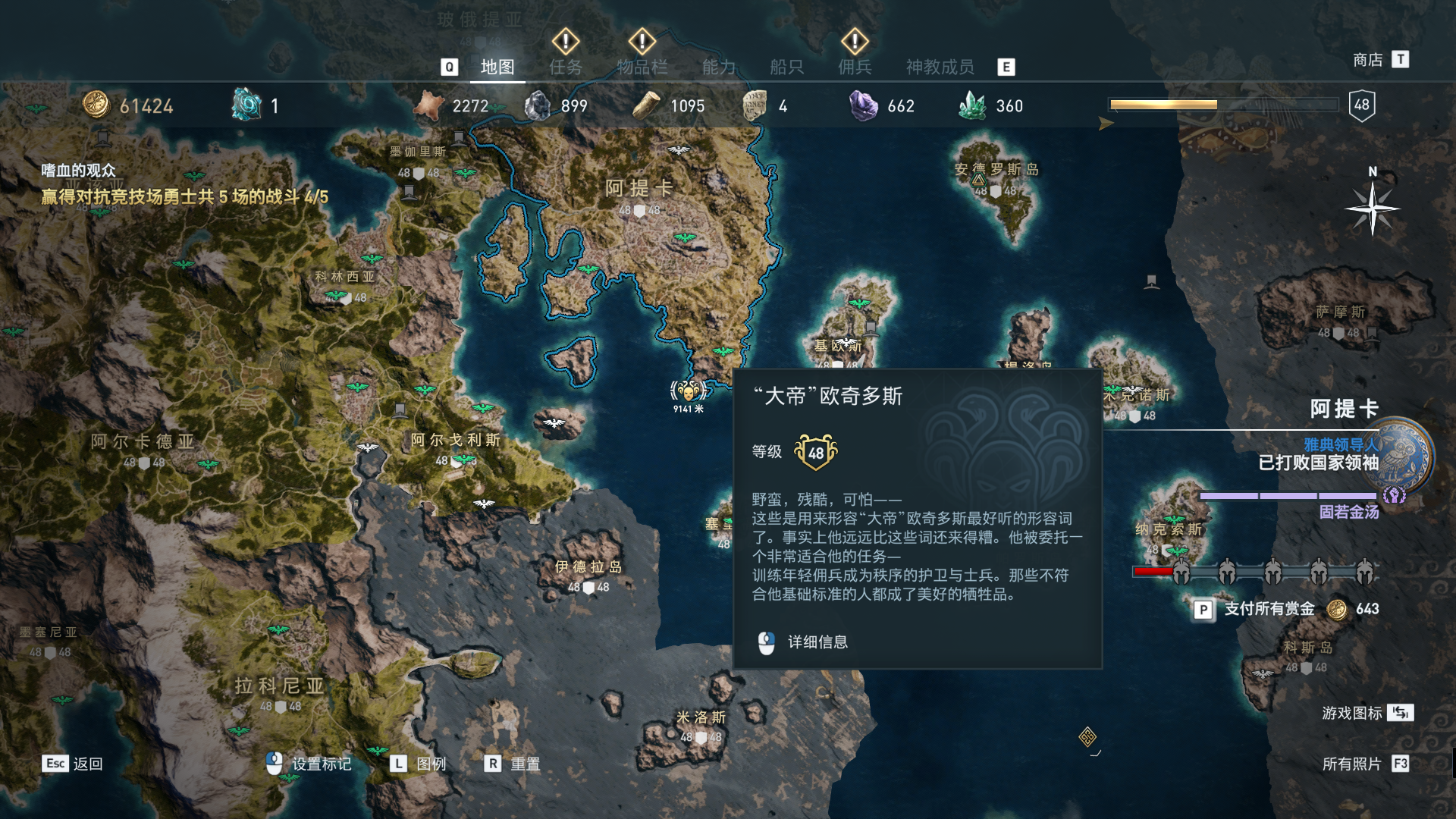 线索:在竞技场战斗可以引出他(竞技场在东南角的佩夫卡)。首先到佩服卡如图位置接“嗜血的观众”任务,选择第四个对手LV43的“雅典的巨石——提托斯”,打败后得到线索,解开“柯灼斯”资料。