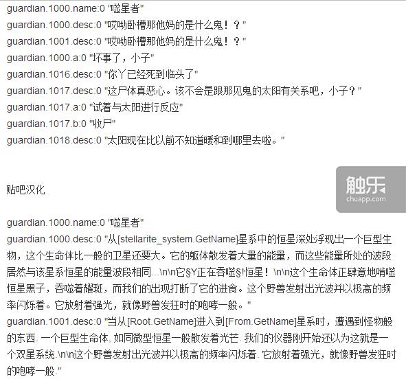 不过也有人对于“靈氣法師”的解释并不满意。《群星》贴吧汉化组负责人“瓦良吉小队长”对于官方汉化版本进行解包后发现,虽然“噬星者”事件确实存在两种事件说明,但是英文版中两个事件说明都有较长的文本段落,官方中文版将两种事件说明都翻译成了:“哎呦卧槽那他妈是什么鬼。”