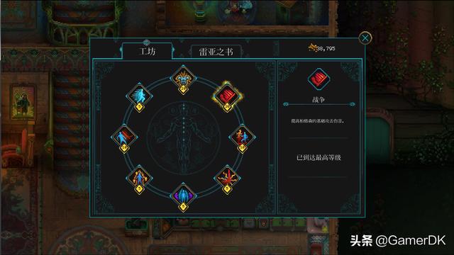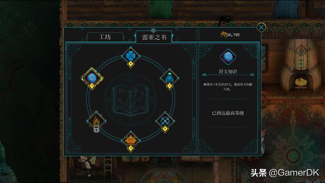 战斗外的养成比较简单,主要包含工坊、雷亚之书和家庭技能。其中工坊和雷亚之书的技能在通关剧情后逐次解锁,消耗战斗中获得的金币可提升等级。工坊主要提供直接的攻击、防御、血量这种属性增益,而雷亚之书主要提供金币掉落加成、新的圣物栏位、多个符文槽位这种功能效果。