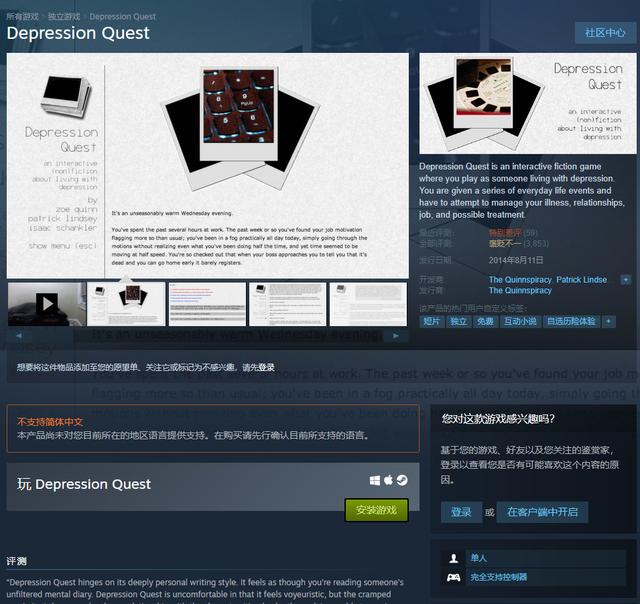 值得一提的是,Zoe Quinn参与制作的《抑郁探索(Depression Quest)》游戏,Steam近期评价变为“特别差评”。