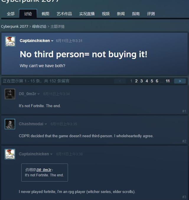 不过也有玩家表示出了反对的声音:没有第三人称=不买,为什么CDPR不提供两个视角?