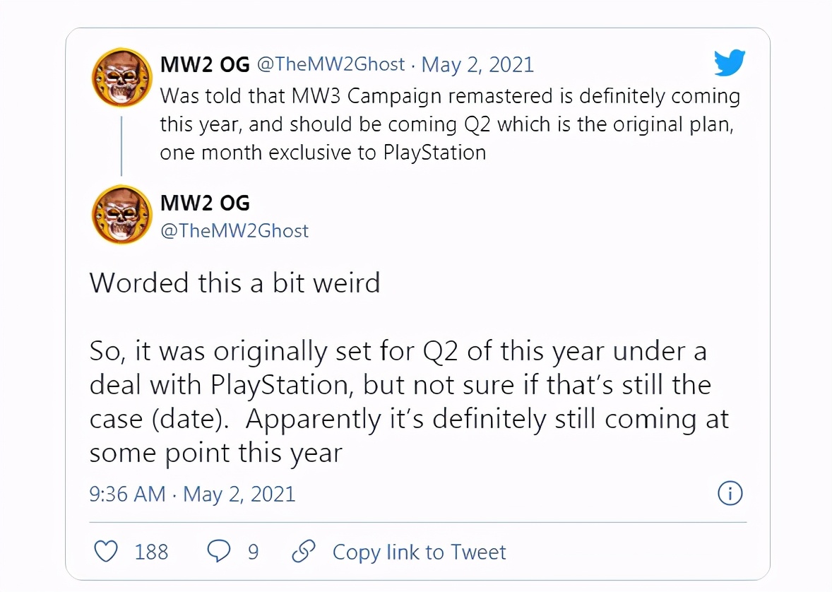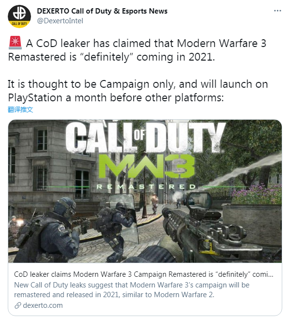 去年动视推出了《使命召唤6:现代战争2重制版》,之后就有传闻称《使命召唤8:现代战争3重制版》也在开发中。根据外媒dexerto报道,该作将在2021年内发售。爆料来自于推特用户TheMW2Ghost,此前TheMW2Ghost也曾准确爆料了《使命召唤》的泄露事件。