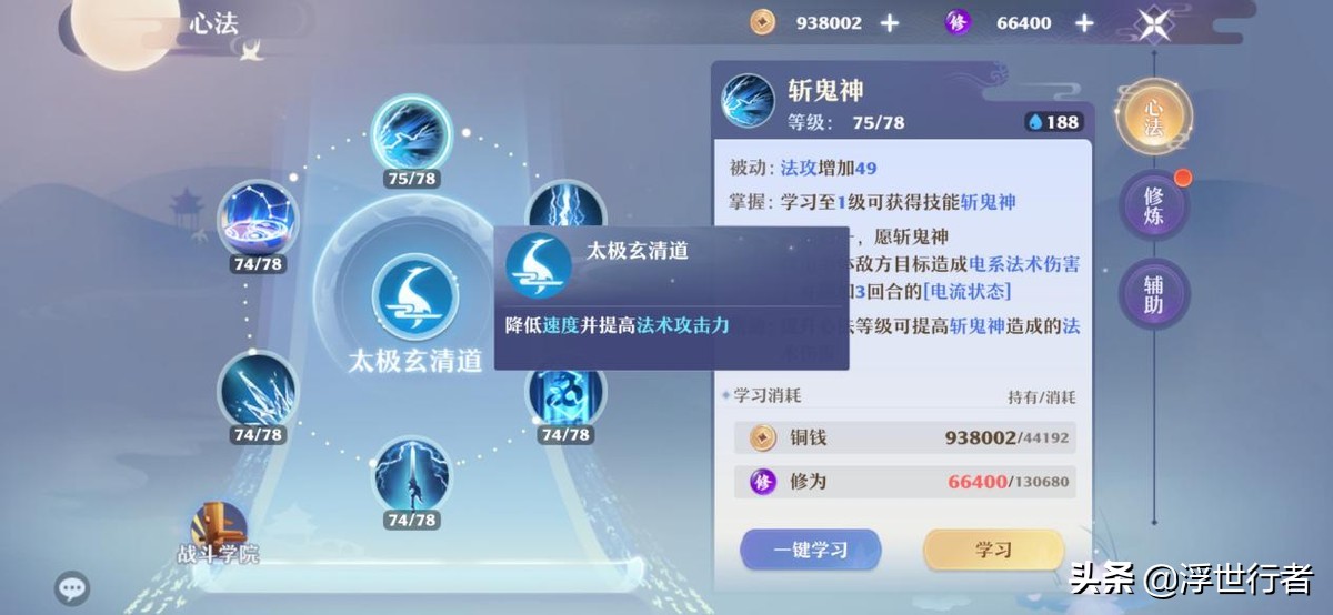 太极玄清道:门派心法,降低速度的同时提高法术攻击力。