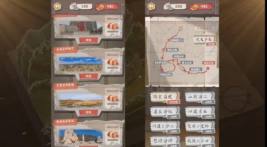 游戏还结合现实,允许玩家通过现实中的健身步数,领取游戏中的“行军券”奖励。而随着长征的推进,玩家还可解锁长征路上不同革命圣地的风物志,在游玩的同时学习到新的知识,寓教于乐的方式。