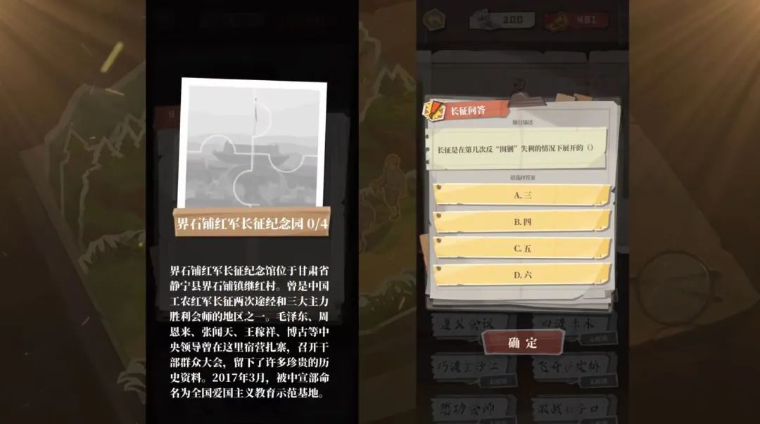 除了前文提到的风物志系统,游戏还有长征问答、党史答题系统,比较巧妙地将长征历史融合进了游戏玩法当中。事实上,每当玩家行至一处,游戏就会弹出相应信息,帮助玩家理解真实的历史事件。
