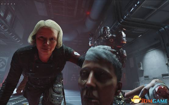 这个女头目觉得没玩够,把目光转向了自己的女儿,用砍掉的头来恶心自己的女儿,女头目的女儿最终忍无可忍和自己的母亲起了冲突。在冲突过程中另一个队友找准了时机,抢夺了把枪,把卫兵突突掉了。主角乘机穿上了动力盔甲。